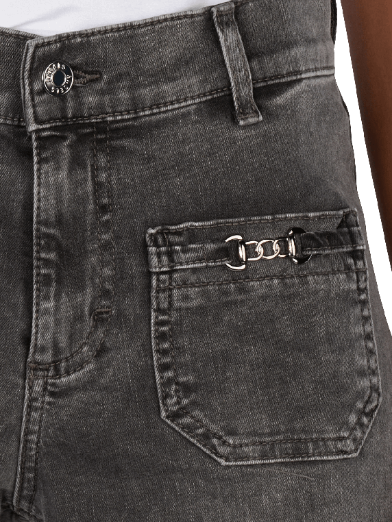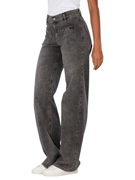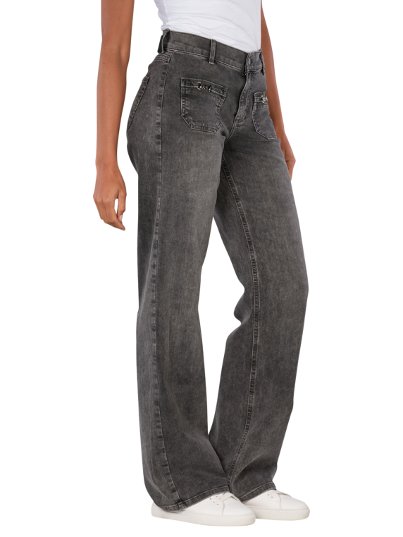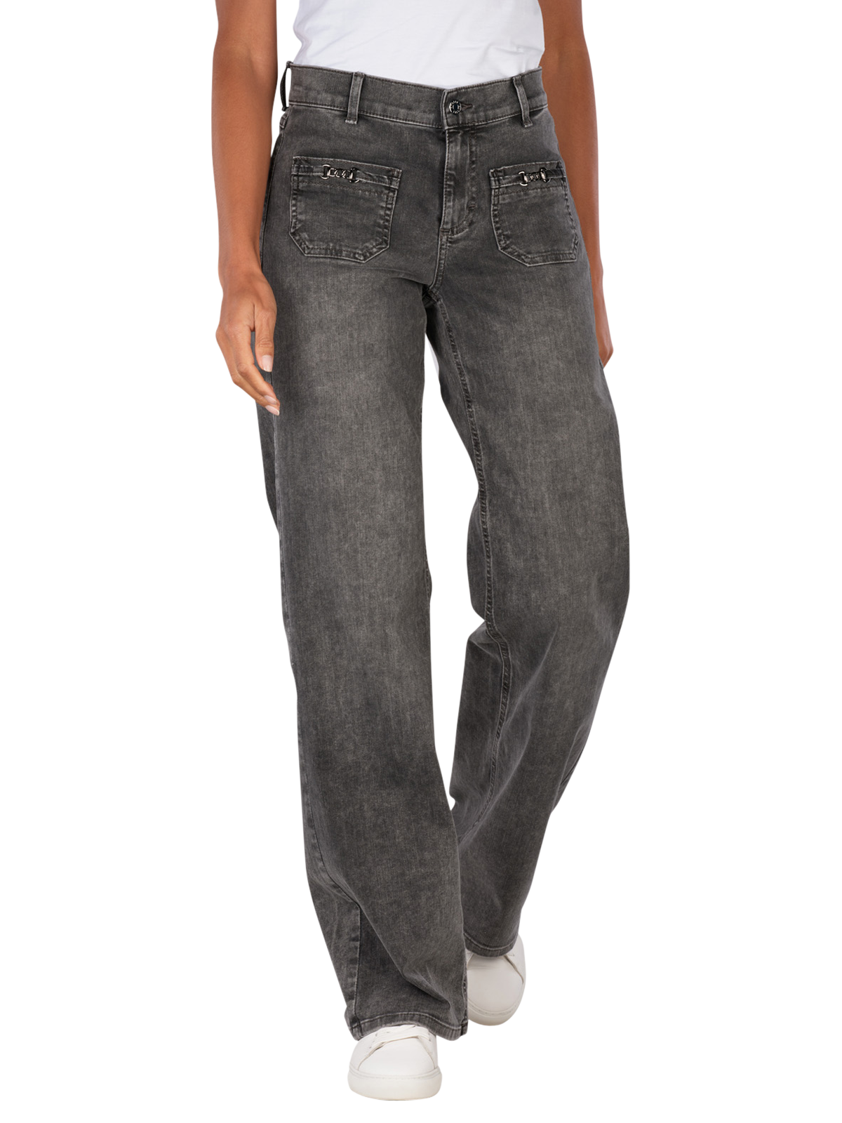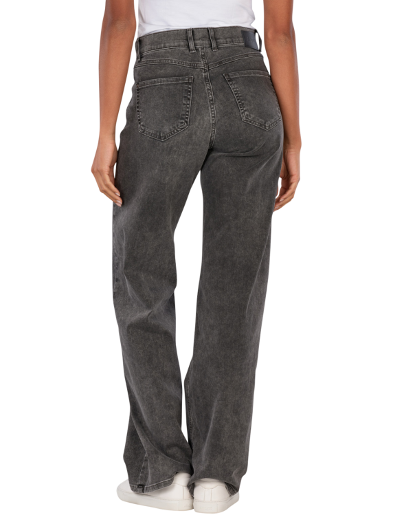 Die Angels Liz Jeans Wide Leg Smart Buckle in Schwarz/Grau bietet eine gerade und weite Passform mit mittlerer Bundhöhe. Sie verfügt über einen Reissverschluss und ein klassisches Five-Pocket-Design. Der Stretchanteil sorgt für hohen Tragekomfort und Bewegungsfreiheit. Diese Jeans eignet sich für verschiedene Anlässe und lässt sich vielseitig kombinieren. Pflegehinweis: Schonwaschgang bei 30°C, nicht bleichen. Eco & Fair produziert.