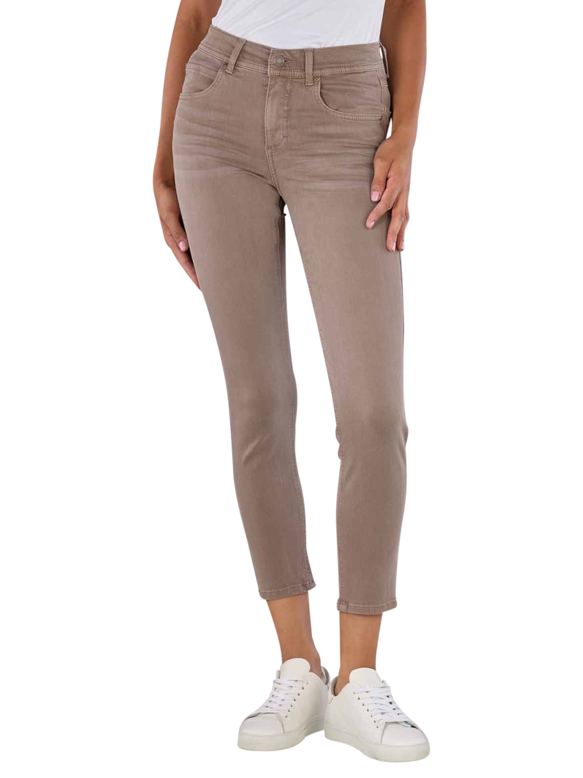 Die Angels Ornella Jeans Sportiv Denim Truffle besticht mit eng anliegendem Beinausschnitt und mittlerer Bundhöhe. Sie kommt in brauner Farbe und ist für Frauen konzipiert. Die Jeans gehört zur Kategorie Slim Fit/Cropped & Ankle und besteht aus Standarddicke-Stoff mit Stretchanteil. Sie verfügt über ein Five-Pocket-Design und Reissverschluss. Die farbige Waschung macht sie modern. Hergestellt aus 93% Baumwolle, 5% Polyester und 2% Elasthan.