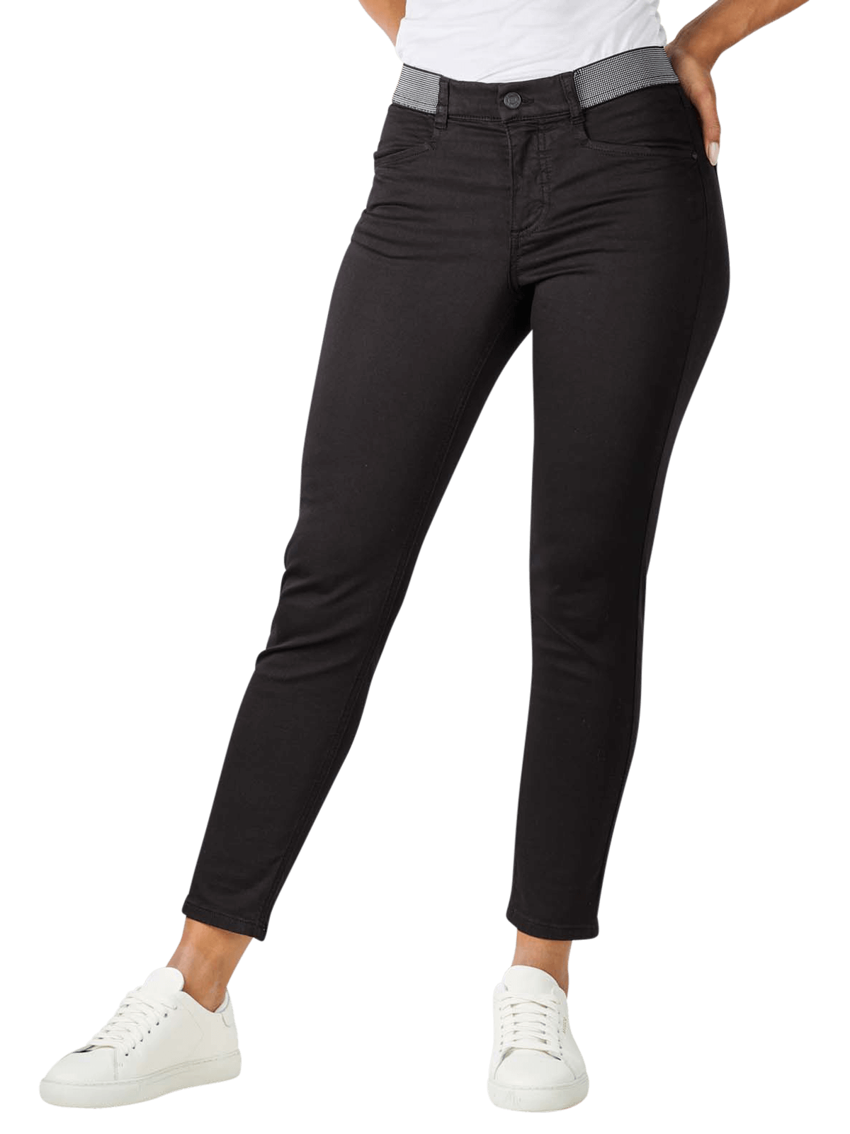 Der kontrastierende Bund zieht die Blicke bei der Damenjeans von Angels auf sich. Das elastische Material des Bundes legt sich vollkommen an die weibliche Figur an. Mit einer mittleren Bundhöhe garantiert er den perfekten Sitz der Jeans. Durch die Materialzusammensetzung aus 85 % Baumwolle, 11 % Elastomultiester und 4 % Elasthan liegen die Hosenbeine sehr eng an, bieten aber trotzdem eine grosse Bewegungsfreiheit. Der dünne Stoff und die verkürzten Beine bis über den Knöchel sorgen für Sommerlaune.