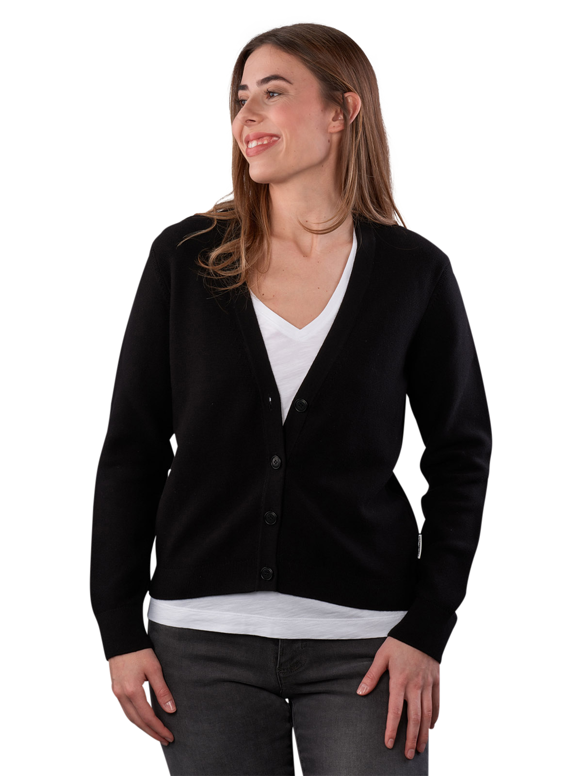 Der Armedangels Menaal Cardigan in Schwarz bietet einen V-Ausschnitt und ist aus 100% Bio Baumwolle gefertigt. Er ist nach dem Global Organic Textile Standard (GOTS) zertifiziert und unterstützt nachhaltige Mode. Der Cardigan kann bei 30°C im Spezialschonwaschgang gewaschen werden und ist pflegeleicht. Er eignet sich hervorragend für die Kombination mit verschiedenen Outfits und bietet einen lässigen, dennoch eleganten Look.