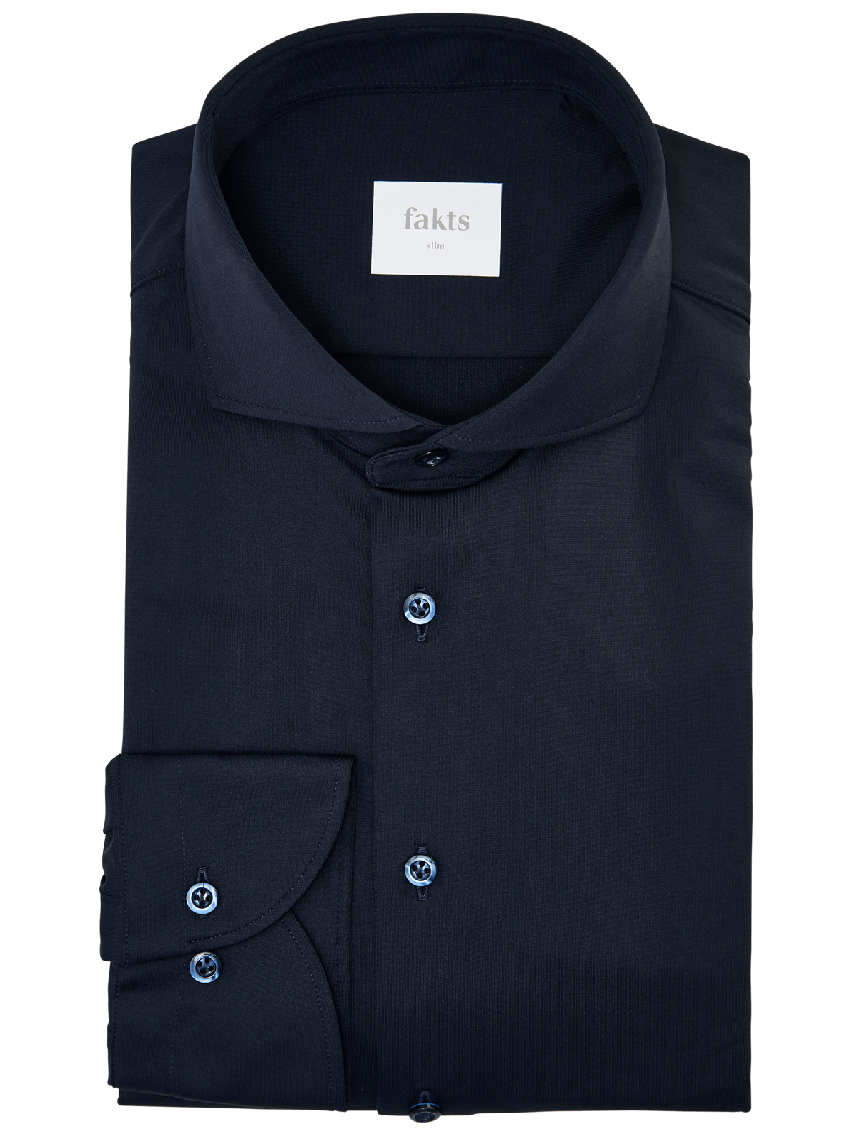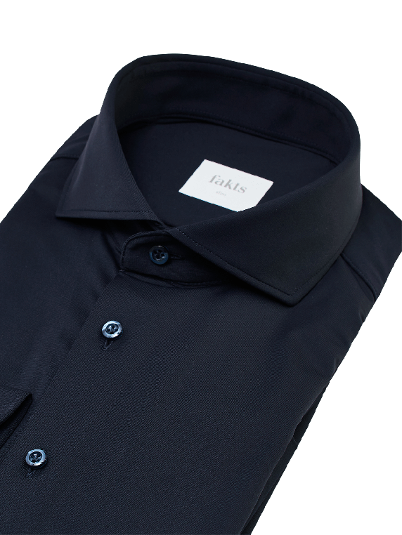 Das unifarbene dunkelblaue langärmlige Hemd ohne Tasche der Trendmarke Fakts überzeugt durch seine Slim Fit Form und dem Material aus bügelleichten Material aus 80 % Polyamid sowie 20 % Elasthan. Der Haikragen ermöglicht das Tragen des Hemdes im alltagstauglichen Casual-Look oder als bürotaugliche Interpretation. Das nicht sichtbare Logo unterstreicht den zurückhaltenden Charakter des vielseitigen Hemdes.