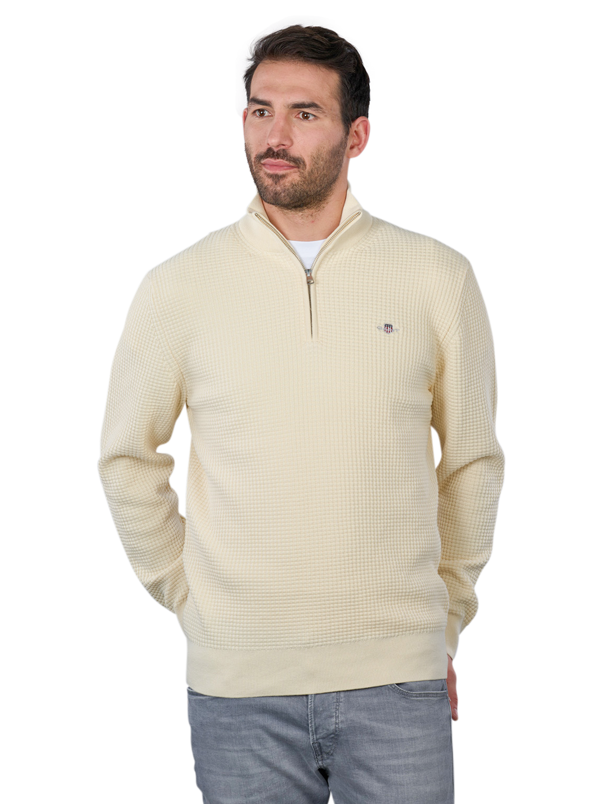 Entdecken Sie den Gant Textured Half Zip Pullover aus hochwertiger Bio-Baumwolle in eleganter Ecru-Farbe. Dieser stilvolle Pullover für Männer überzeugt durch seinen praktischen Reissverschluss-Kragen und die angenehme Haptik. Ideal für lässige Anlässe, bietet er sowohl Komfort als auch ein modisches Design. Der Pullover ist pflegeleicht und kann im Normalwaschgang bei 40°C gewaschen werden. Setzen Sie auf Nachhaltigkeit und zeitlosen Stil mit diesem vielseitigen Kleidungsstück von Gant!