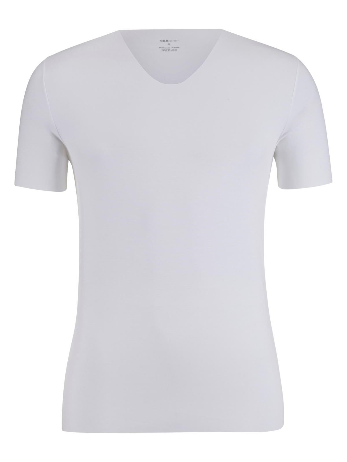 Schlicht weiss, mit kurzen Ärmeln und körpernah geschnitten, ist das ISA T-Shirt V-Neck Freecut. Es ist mit einen taillierten Schnitt und einen leichten V-Ausschnitt versehen. Gefertigt aus 87 % Modal und 13 % Elasthan kann das Shirt sogar bei bis zu 60 % in der Maschine gewaschen und in den Trockner gegeben werden. Ein Logo ist nur auf der Innenseite des Nackens zu sehen.