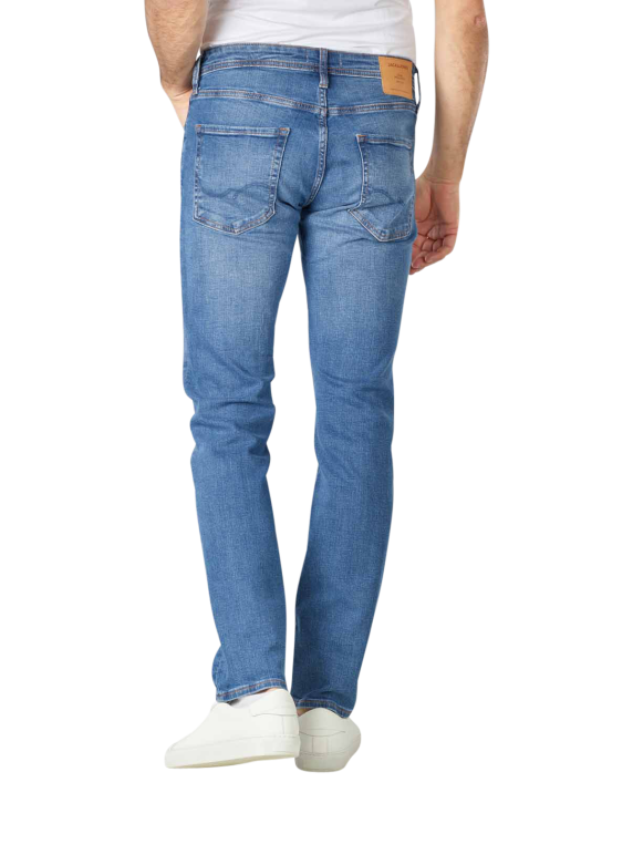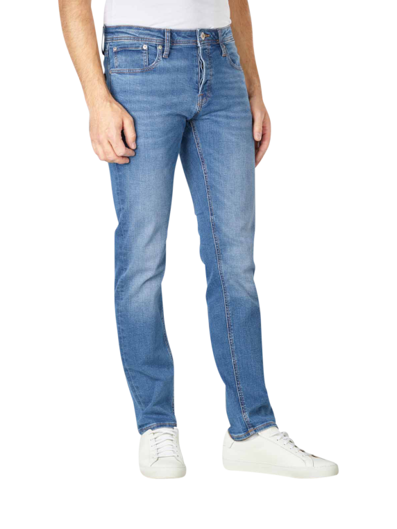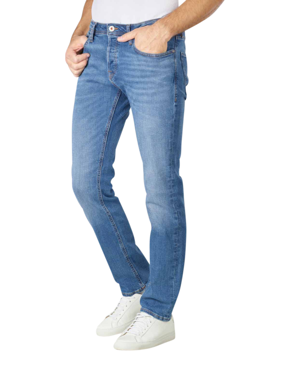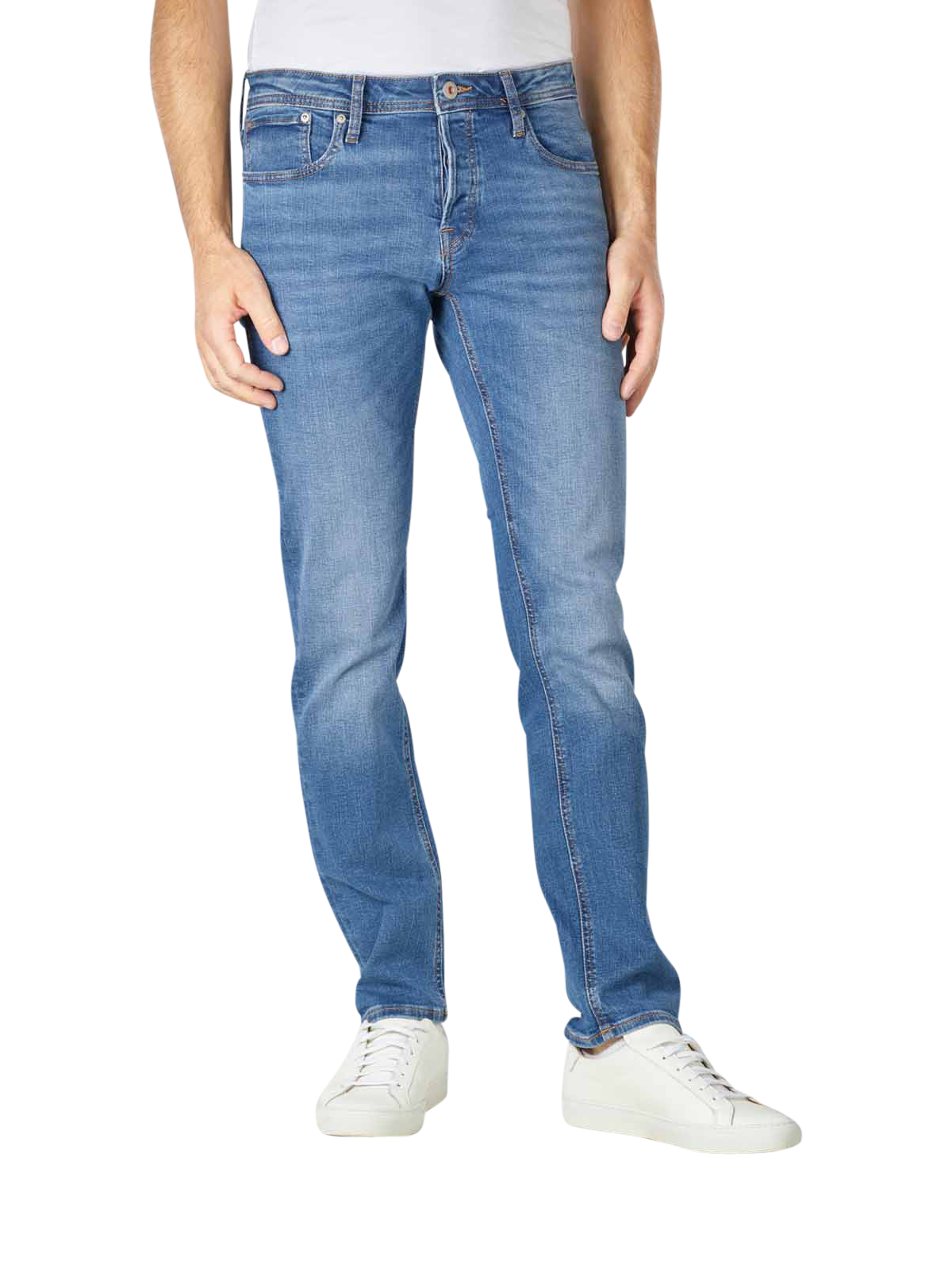 Die Jack & Jones Tim Jeans Slim Fit in der Farbe Blue Denim hat einen mittelhohen Bund und enge, gerade geschnittene Beine, die die männlichen Konturen betonen. Hergestellt aus einem Baumwollgemisch mit Stretch-Anteil, ist die Herrenjeans strapazierfähig und bietet den ganzen Tag einen hohen Tragekomfort. Die intensiven Waschungen und optischen Sitzfalten verleihen der bei 40 °C waschbaren 5-Pocket-Jeans eine stylische Optik.