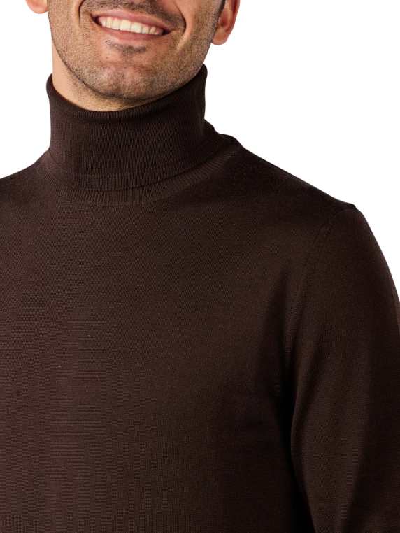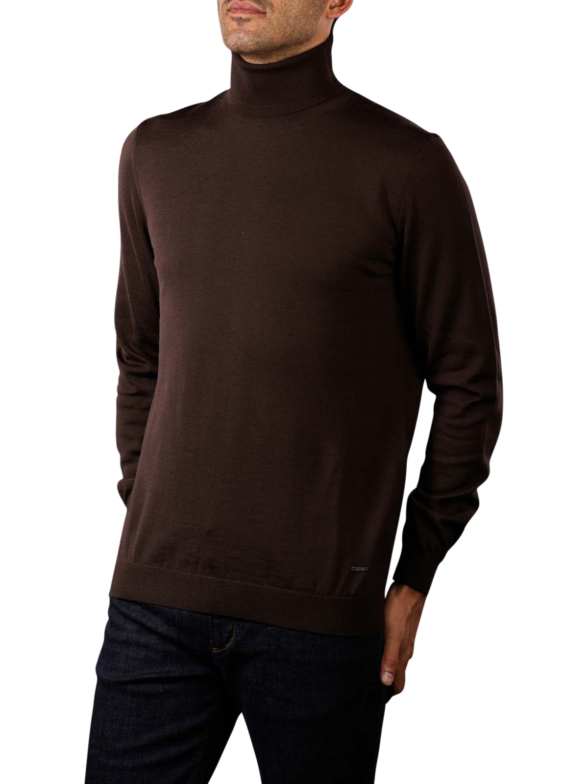 Der Strickpullover Donte von Joop ist ein klassisch gerade geschnittener Rollkragenpullover. Das Markenlogo Joop ist dezent sichtbar angebracht. Der Pullover wurde aus reiner Schurwolle gefertigt und ist braun. Die Ärmel und der Saum sind mit einem gerippten Abschluss versehen. Der Pullover wird mit Handwäsche gewaschen. Er kann jedoch auch in die Reinigung gebracht werden.