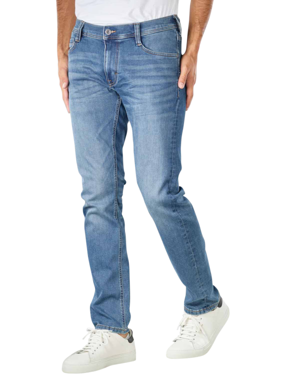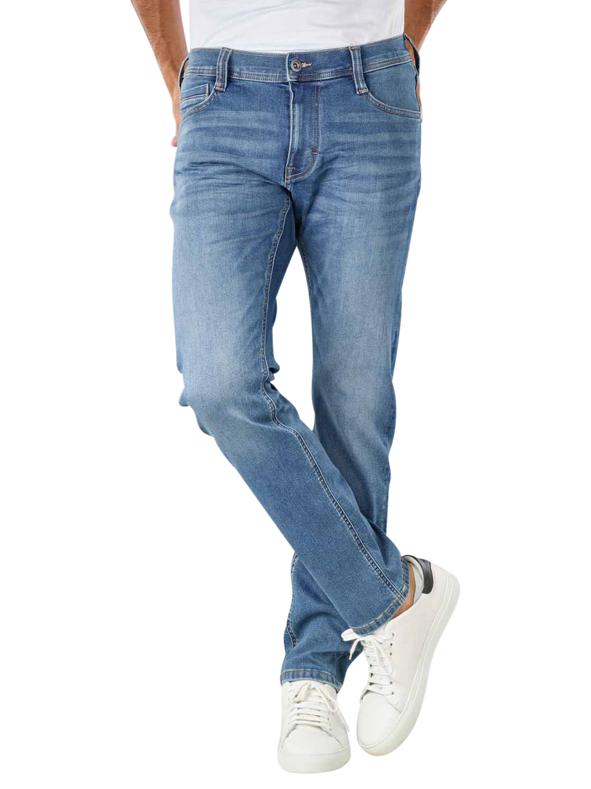Die Mustang Oregon Tapered Jeans in der Farbe Medium Blue besteht aus einem weichen Baumwollmix mit Elasthananteil. Dank mittlerer Leibhöhe sitzt die Herrenjeans bequem knapp unter dem Bauchnabel, während der figurnahe Slim Fit Schnitt die Kurven betont. Der konische Beinverlauf und die dezente Waschung verleihen der Jeans einen besonders lässigen Look. Reinigen lässt sie sich unkompliziert bei 30 °C im Normalwaschgang.