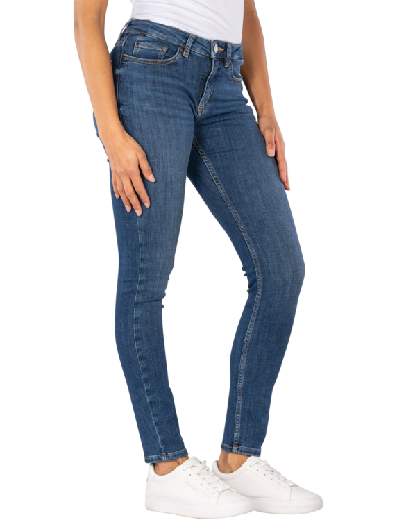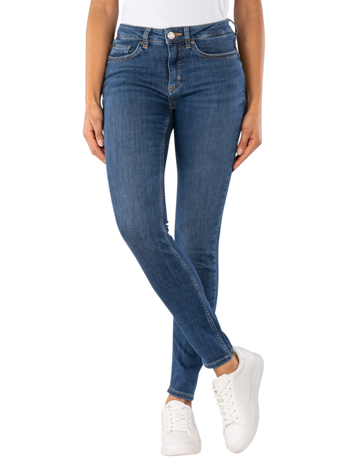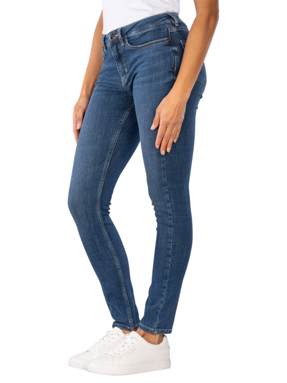 Die Opus Elma Jeans Skinny Fit in Strong Blue bietet einen engen Beinausschnitt und eine niedrige Bundhöhe. Die Jeans ist in einem mittleren Blau gehalten und verfügt über einen praktischen Reissverschluss. Mit ihrem Stretchanteil passt sie sich der Körperform an und sorgt für hohen Tragekomfort. Die Five-Pocket-Design ermöglicht ausreichend Stauraum für persönliche Gegenstände. Pflegeleicht im Schonwaschgang bei 30°C, ist sie eine vielseitige Ergänzung für jede Garderobe.