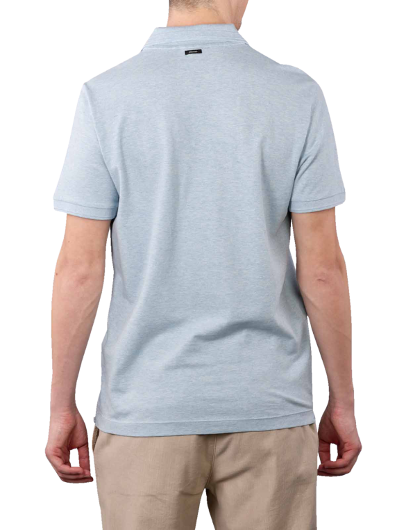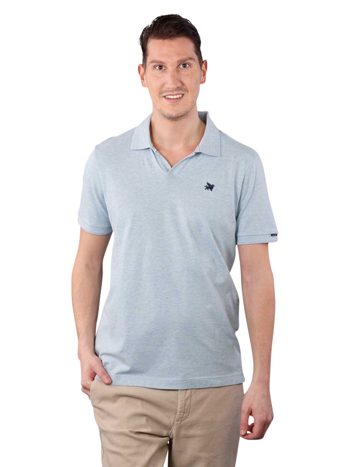 Das hellblaue Polo Shirt im Regular Fit Style aus 97 % Baumwolle und 3 % Elasthan mit kurzem Arm ohne Brusttasche ist unifarben. Das Logo mit dem beflügelten Löwen der angesagten Trendmarke ist dezent in dunkler Farbe abgesetzt auf der linken Brustseite sichtbar.