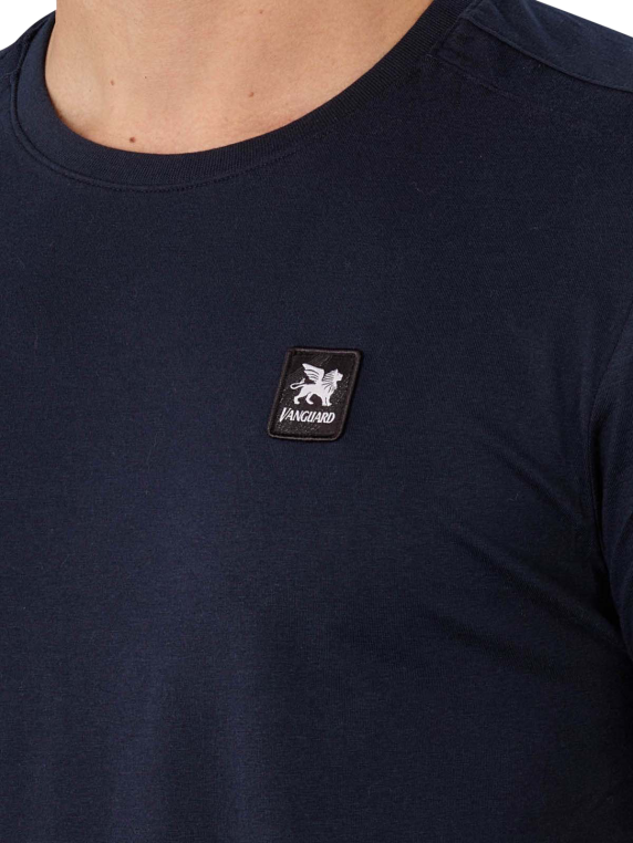 Das Vanguard Crew Neck T-Shirt Jersey in der Farbe Sky Captain ist ein stilvolles, dunkelblaues T-Shirt für Männer. Es besticht durch seine Rundhals-Kragenform und bietet dank der Materialzusammensetzung von 95% Baumwolle und 5% Elasthan optimalen Tragekomfort. Das T-Shirt ist pflegeleicht und sollte im Spezialschonwaschgang bei 40°C gewaschen werden. Bleichen ist nicht erlaubt. Ideal für lässige Anlässe und ein unverzichtbares Basic in jeder Garderobe.