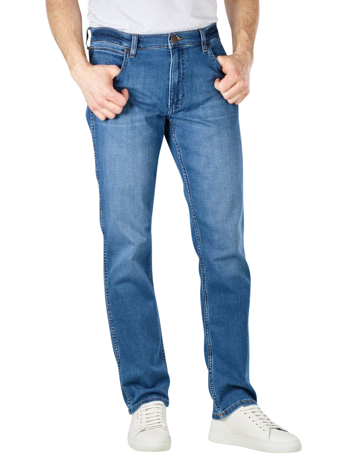 Die Wrangler Greensboro Jeans in Straight Fit besticht durch ihr lockeres Design. Die klassische Five-Pocket-Jeans wird durch einen Reissverschluss geschlossen. Das Labelpatch von Wrangler sticht durch seine Lage auf der rechten Gesässtasche hervor. Auf den Gesässtaschen sind überdies Ziernähte in W-Form angebracht. Eine leichte Waschung an den Oberschenkel sorgt für einen unauffälligen Used-Look. Der dünne Stoff der Herrenjeans ist mit einem Stretchanteil versetzt, weswegen die Hose angenehm zu tragen ist.
