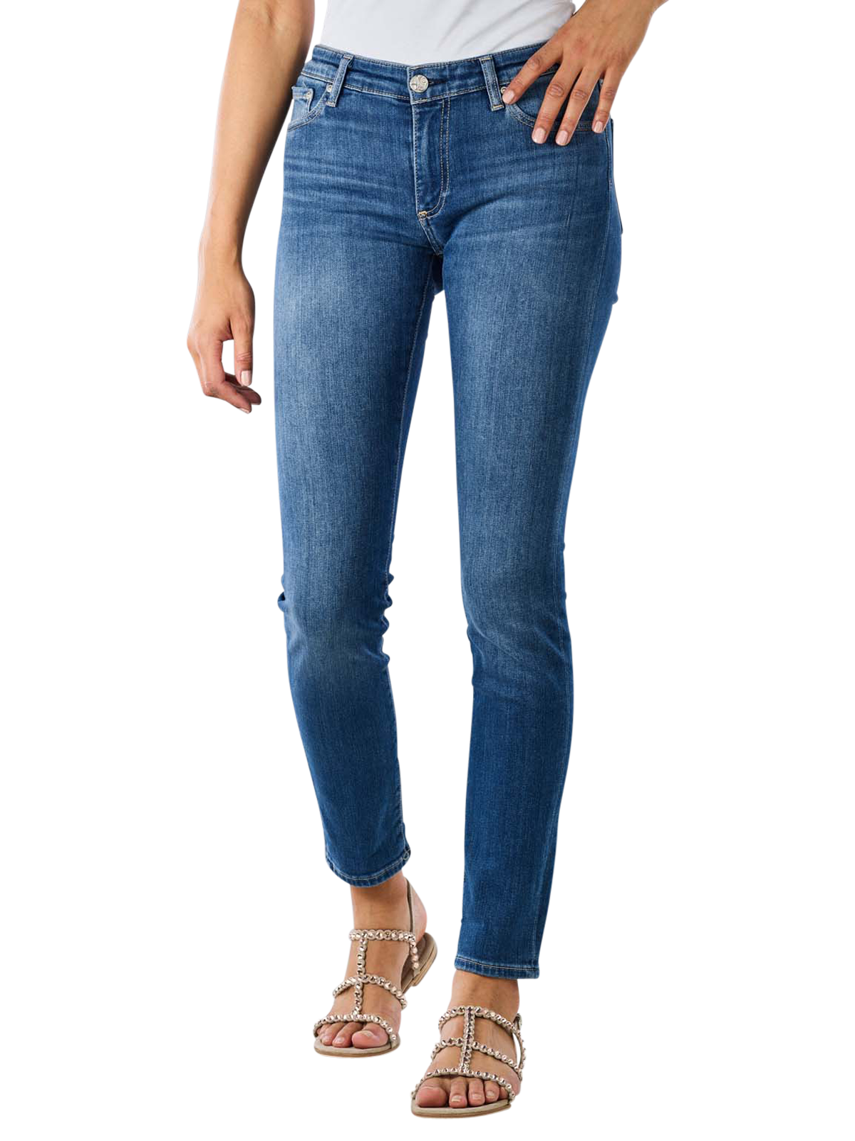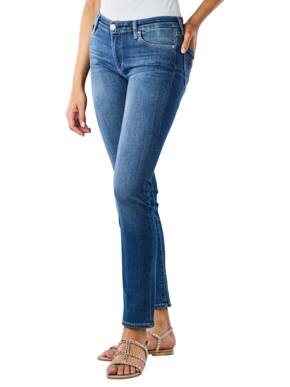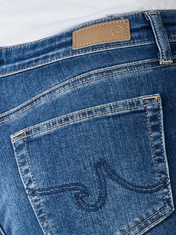 The AG Jeans Mid Rise Prima Skinny Fit Cropped in the colour blue is a figure-hugging five-pocket jeans with a regular waistband and tight-fitting legs that reach the ankles. They are made from a cotton material mix with stretch content and can be washed at 30 °C on a gentle cycle. The jeans close with a button and zip. The bright double decorative seams create a subtle, attractive contrast.