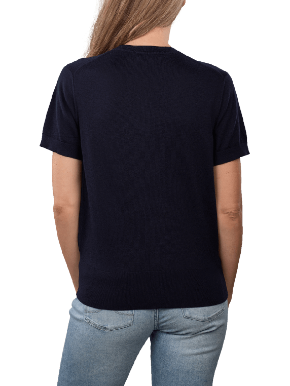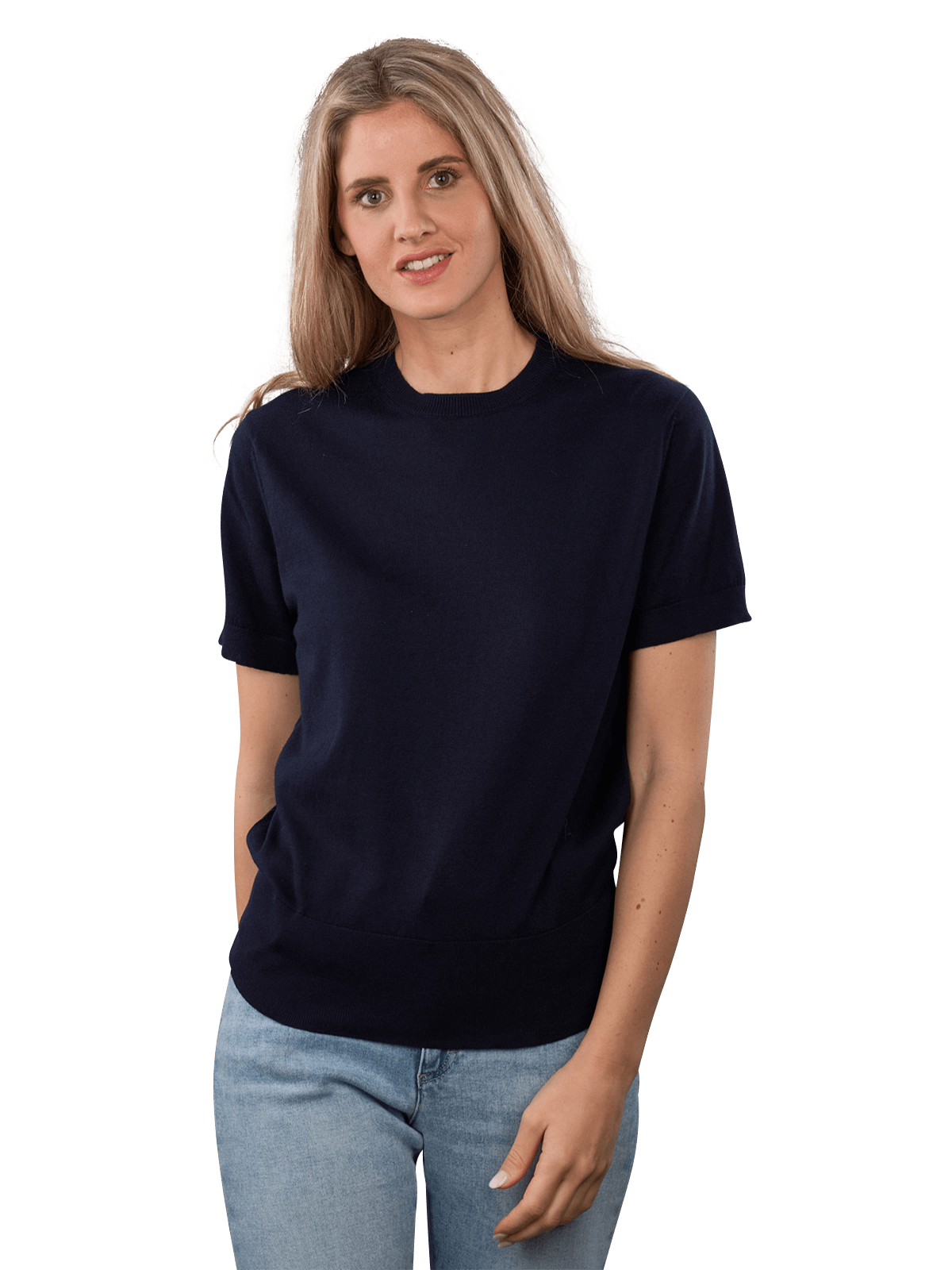 The Armedangels Fine Knit Pullover Short Sleeve in Tinted Navy features a round neck and short sleeves. Made from a blend of organic cotton and modal, it provides a comfortable wearing experience. The pullover is easy to care for and can be washed at 30°C on a gentle cycle. It is suitable for various occasions and can be combined in many ways.