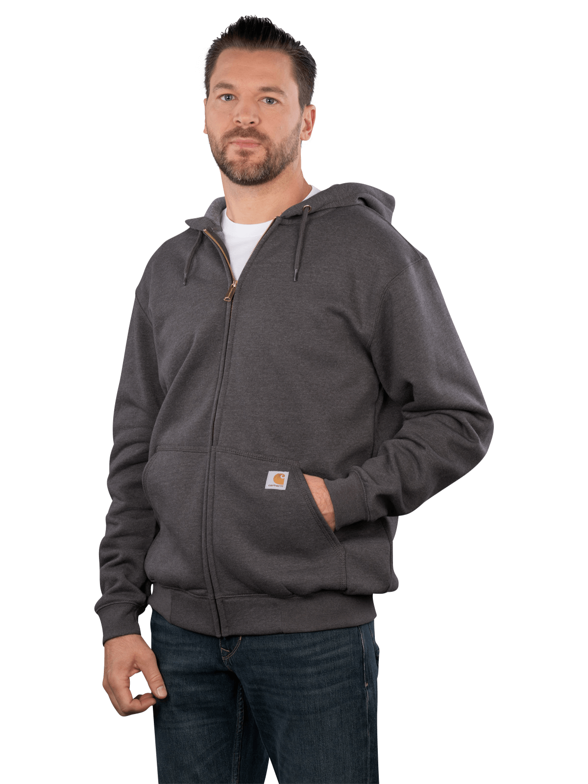 The Carhartt Marquette Full Zip Sweatshirt in Carbon Heather offers a comfortable fit for men. With a non-removable hood and a full-length zipper, it is versatile. The trojer collar provides additional comfort. Easy to care for in a normal wash cycle at 30°C, it is a practical choice for everyday wear. The combination of cotton and polyester ensures a pleasant wearing experience.