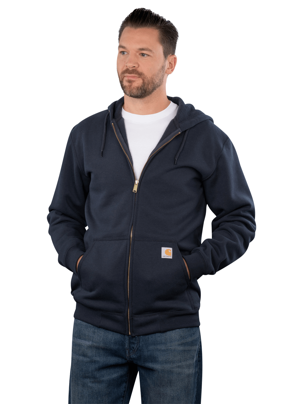 The Carhartt Marquette Full Zip Sweatshirt in Dark Blue offers a comfortable fit for men. With a non-removable hood and a full-length zipper, it is versatile. The trojer collar provides additional comfort. The sweatshirt is easy to care for and can be washed at 30°C. It is well-suited for leisure activities or relaxed days at home.