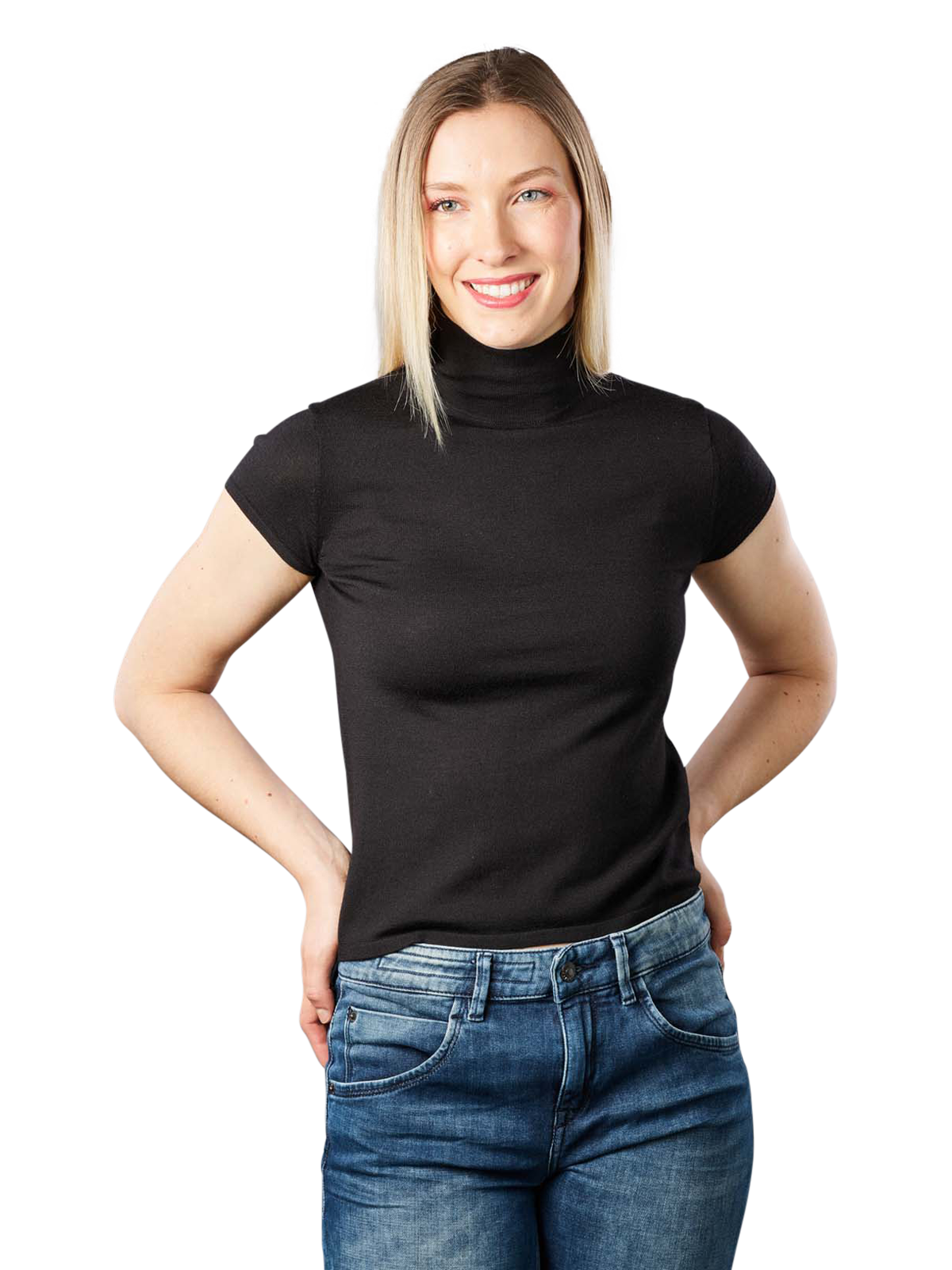 A great combination partner and an essential basic in your wardrobe is the monochrome short-sleeved jumper from the Drykorn brand. The knitted jumper has a close-fitting stand-up collar and is cut to match the waistband of the trousers. The material made of wool, silk and a small amount of cashmere is very comfortable on the skin and the jumper can be washed by hand.