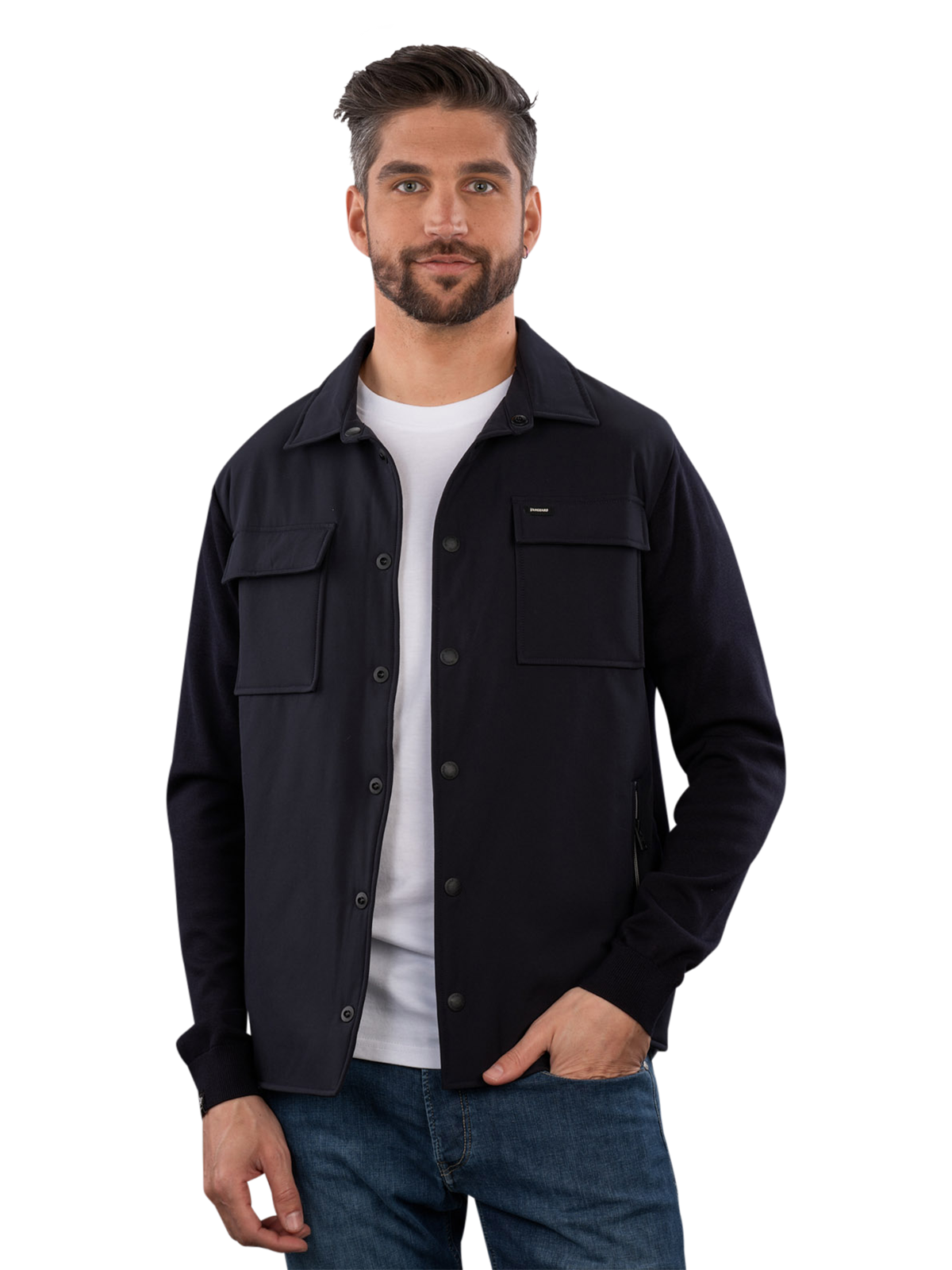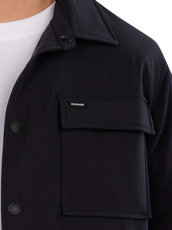 The Vanguard Jacket Button Sky Captain in Dark Blue features a classic polo collar and is made from a cotton-Tencel blend. It has no hood and is suitable for casual occasions or as a light layer. The special gentle wash cycle at 30°C ensures easy care. This jacket combines comfort with a timeless design that can be versatile.