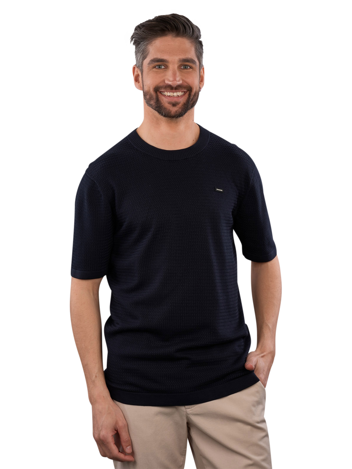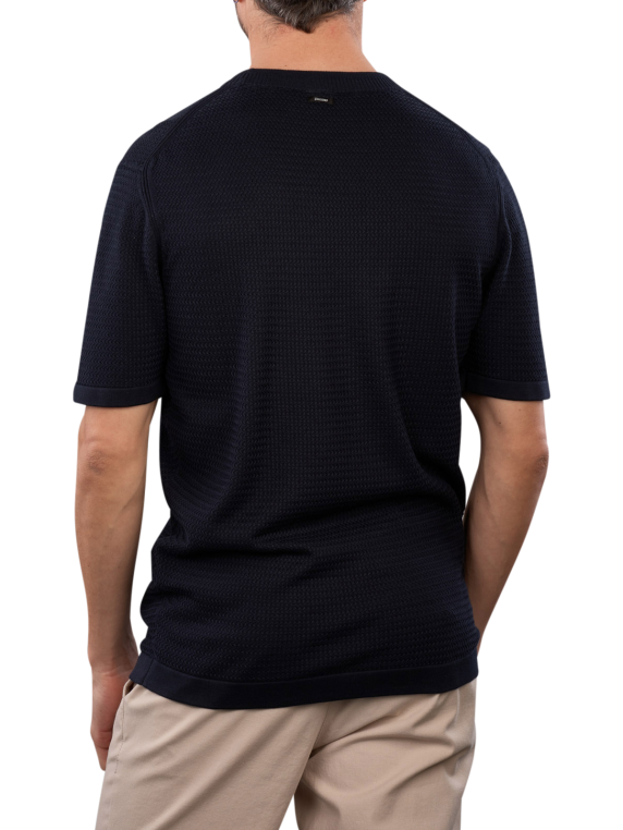 The Vanguard T-Shirt Round Neck Sky Captain in Dark Blue features a round neckline and is designed for men. It combines 50% cotton with 50% modal for comfortable wear. The T-shirt can be washed at 30°C on a special gentle cycle and is easy to care for, as it should not be bleached. It is suitable for various leisure activities and can be combined in many ways.