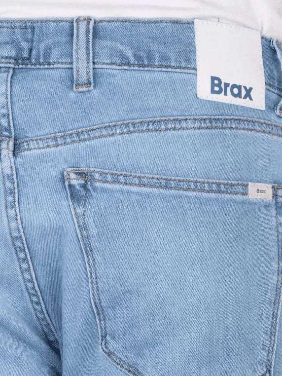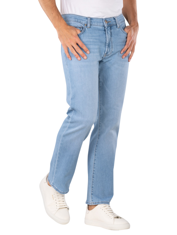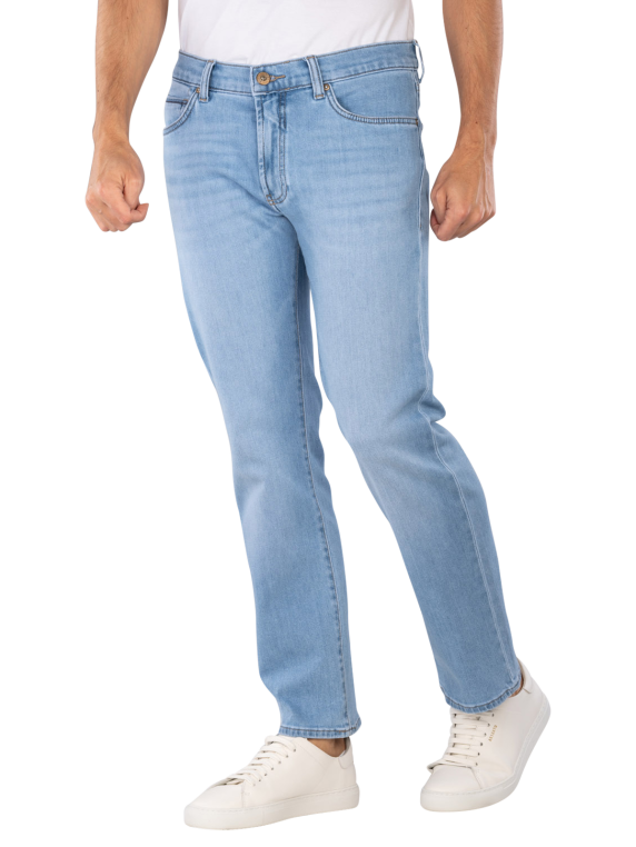 The Brax Clint Jeans Straight Fit Warm Days Blue is a straight-cut jeans for men with a medium rise. It features a light wash and a practical zipper. The stretch content provides freedom of movement and comfort. These five-pocket jeans are suitable for various leisure activities and can be combined in many ways. Care instructions: gentle wash at 30°C, do not bleach.