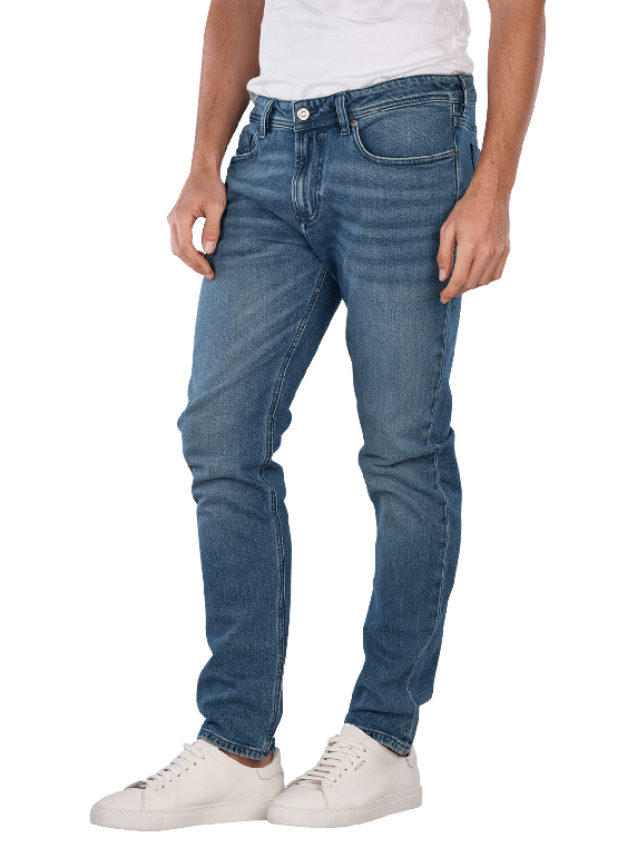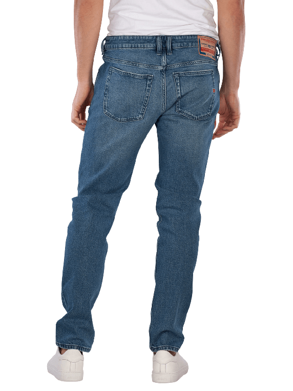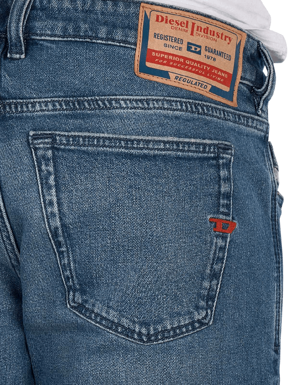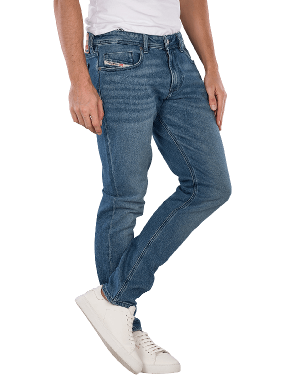 The Diesel 1979 Sleenker Skinny Fit Jeans in medium blue offers a tight fit with a low waistband. It features a classic five-pocket style and a zipper. The stretch content provides freedom of movement and comfort. These jeans are suitable for various leisure activities and can be combined in many ways. Care instructions: gentle wash at 30°C, do not bleach.