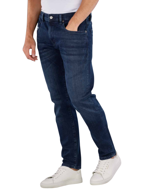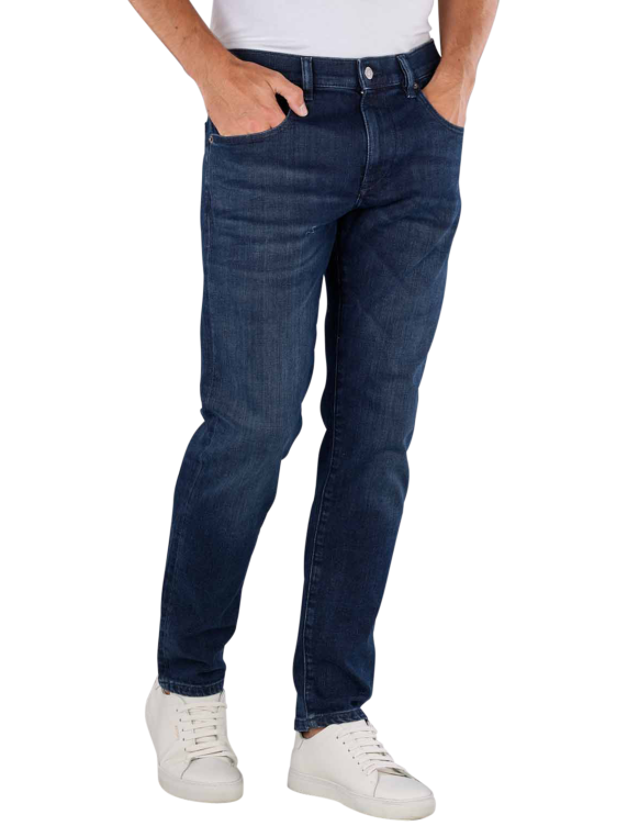 The Diesel 2019 D-Strukt jeans are slim fit trousers for men in dark blue. They have a narrow leg cut and a mid-rise waist. The fabric has a standard thickness with stretch in 98% cotton and 2% elastane. The five-pocket jeans with zip have a dark wash and should be washed at 30°C on a gentle cycle. Do not bleach.