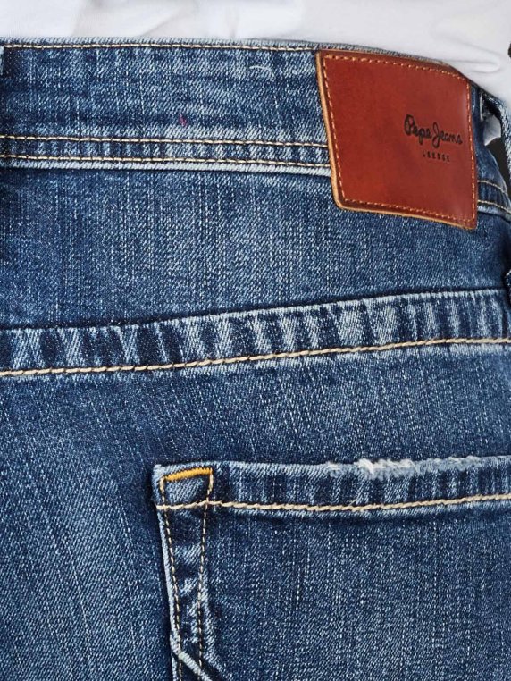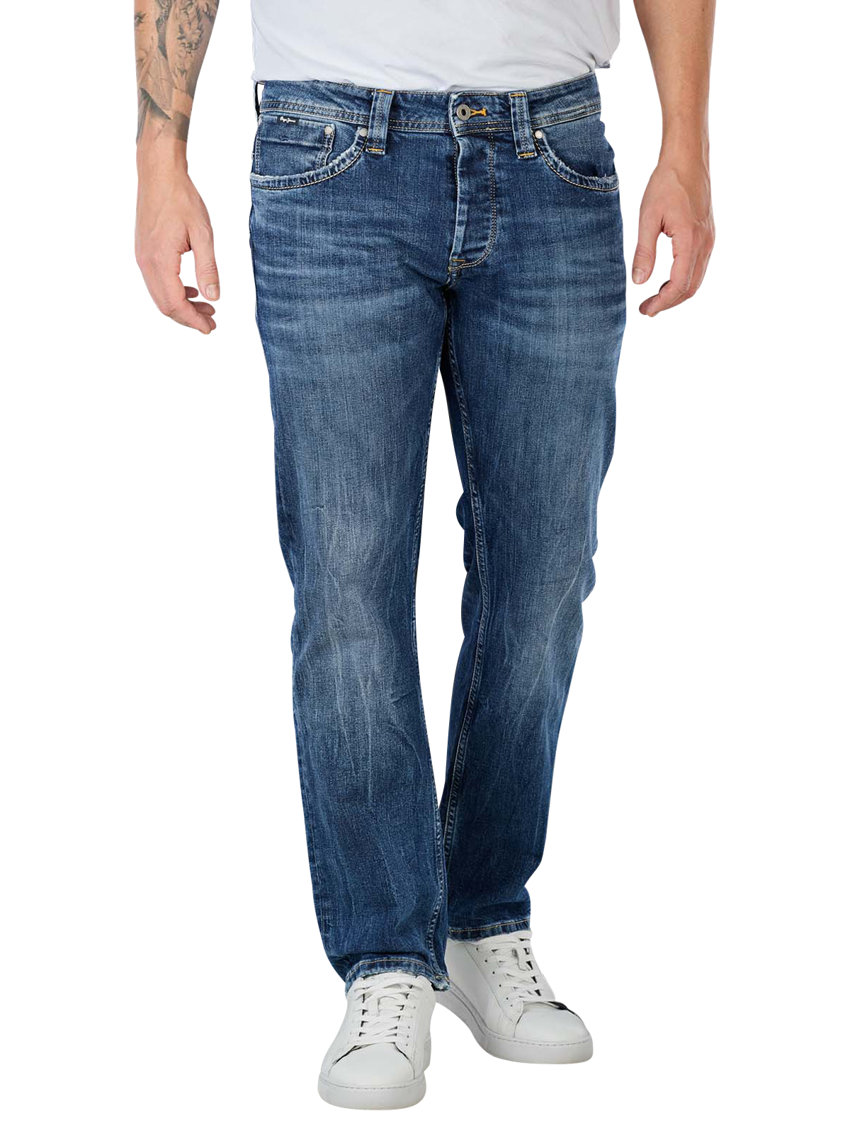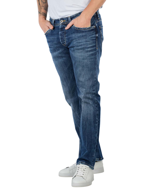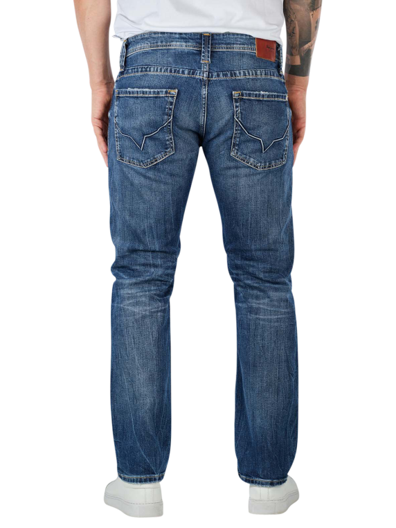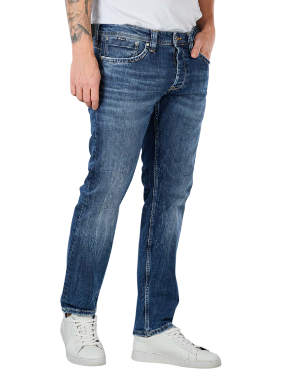 This Pepe Jeans Cash Straight Fit in the color Streaky Stretch Med are classic five-pocket casual jeans. They are comfortable thanks to their stretch content. The pants with a button placket are woven from high-quality denim material and are very easy to care for. They are available in straight fit and offer a medium waist height.