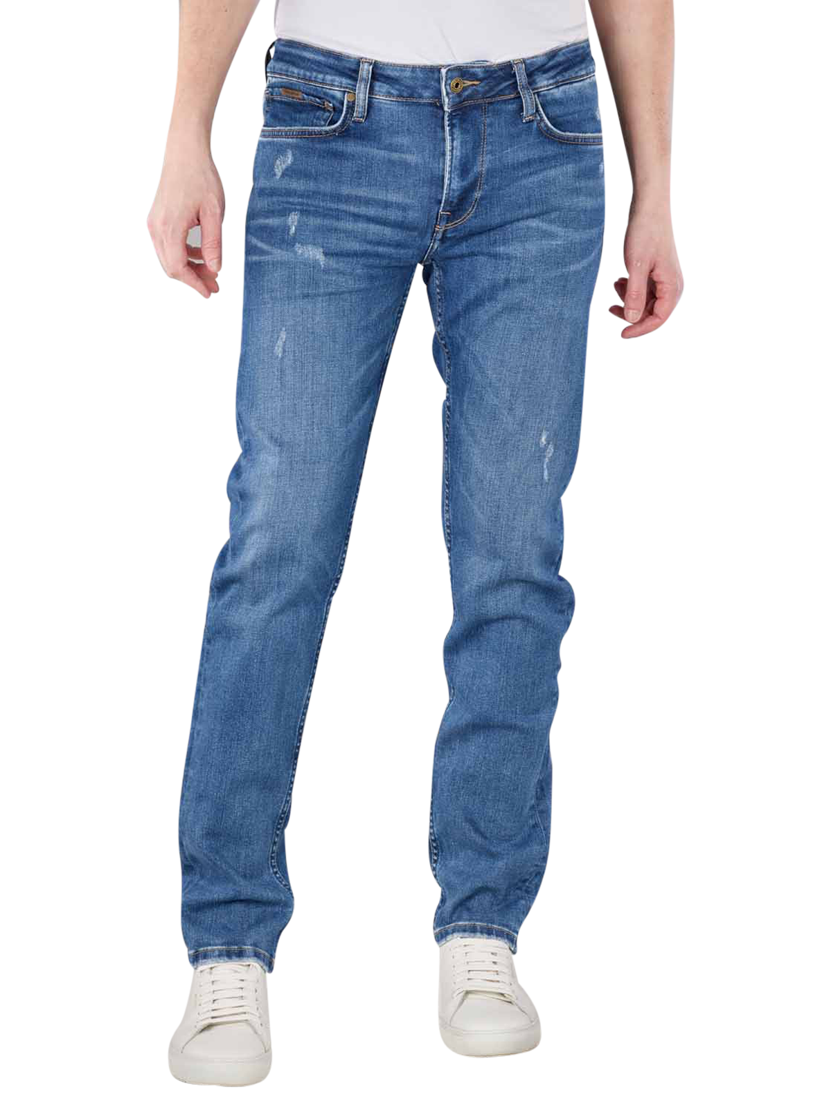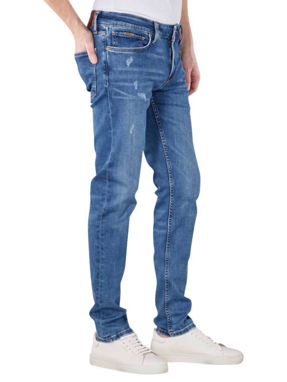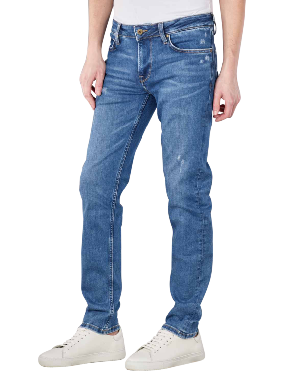 These medium blue slim fit jeans from the trendy Italian label were produced using the wiser wash principle. The jeans with stretch and five pockets have a mix of straight fit and slim fit. The waistband has a medium rise. The thighs are narrow to straight. The straight to wide leg cut provides a particularly fashionable accent.