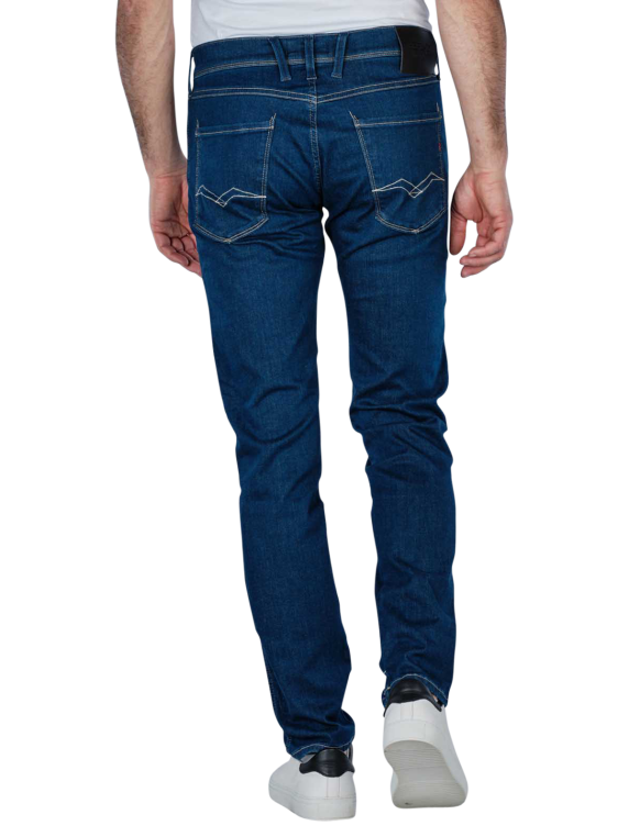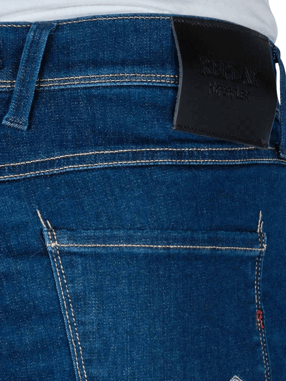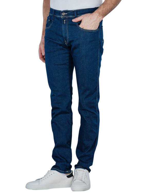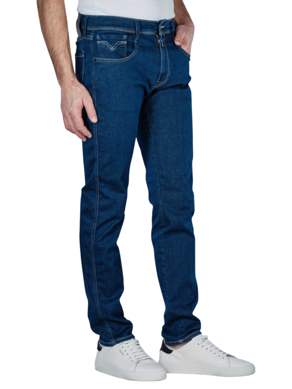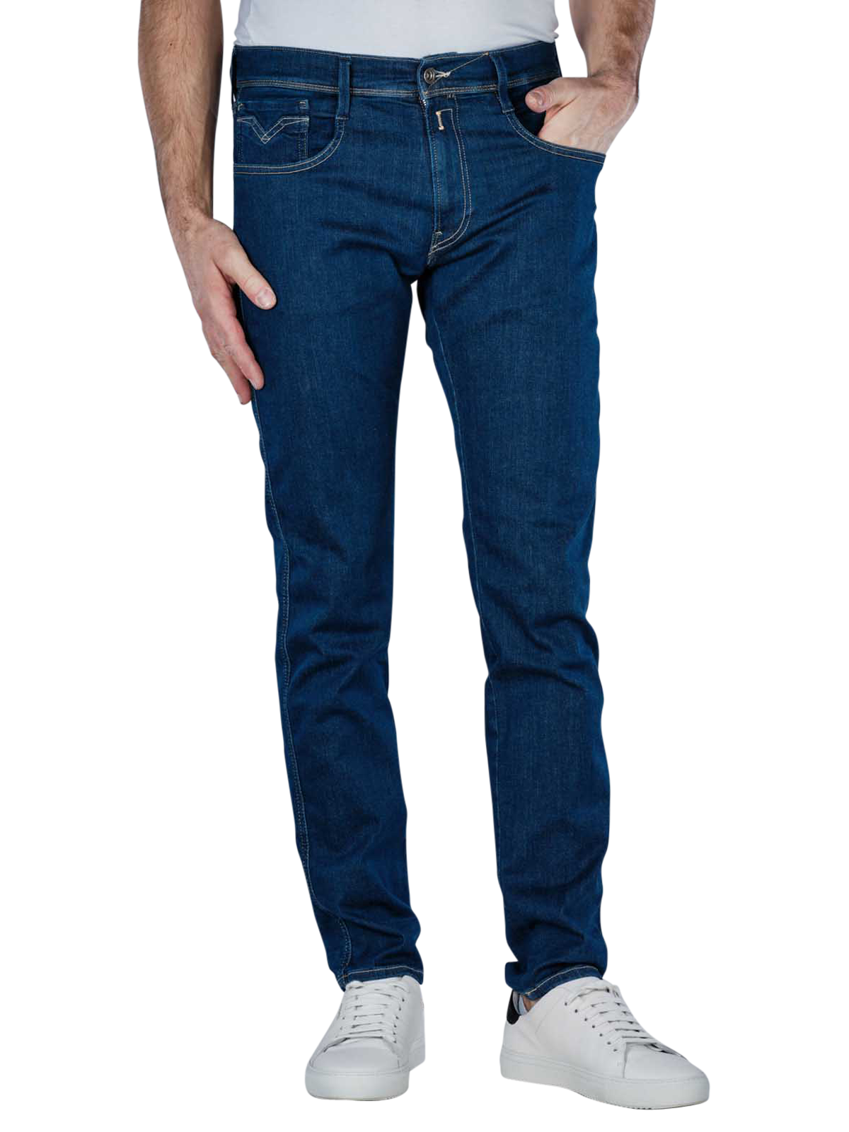 The Replay Anbass jeans for men offer a modern slim fit in a dark blue colour. With a narrow leg cut and a mid-rise waistband, they combine style and comfort. The stretch content ensures optimum freedom of movement. These five-pocket jeans have a practical zip fastening and are characterised by a dark wash. They are made from a high-quality blend of materials: 89% cotton, 8% elastomultiester and 3% elastane. Easy to care for at 30°C on a gentle wash cycle.