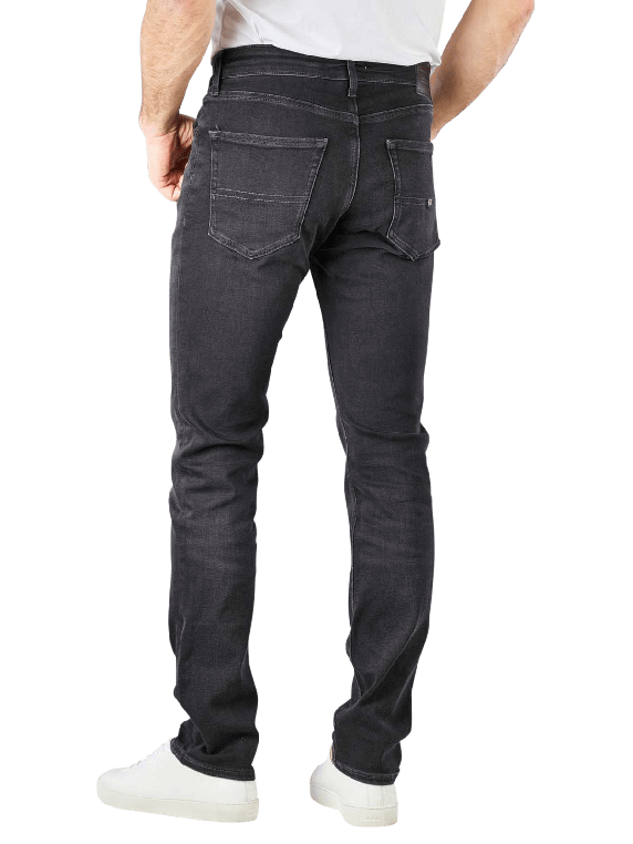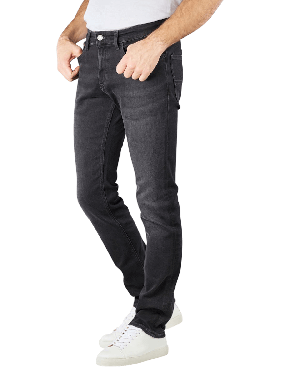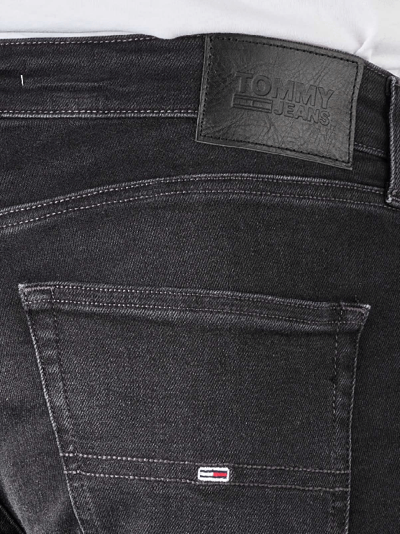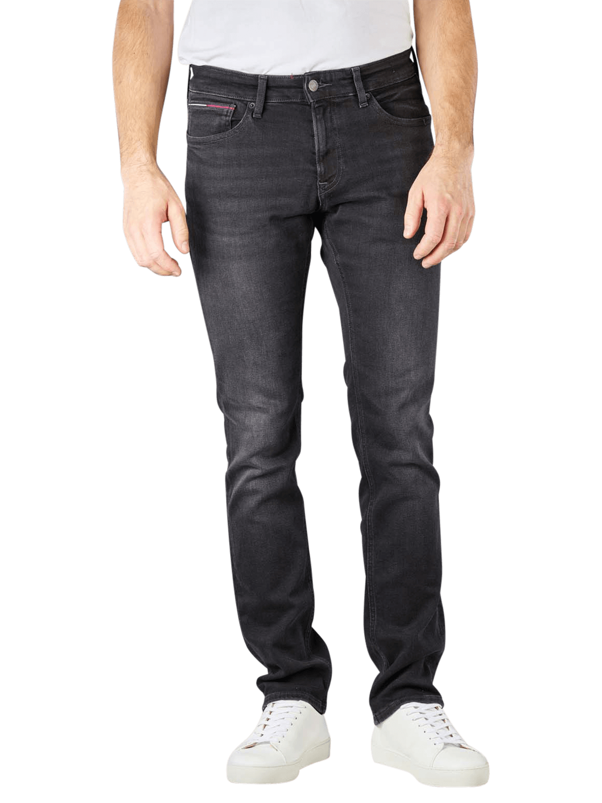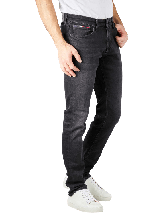 The Scanton slim fit men's jeans from the Tommy brand are a fashionable model in denim black. Made from 91% cotton, 6% elastomultiester and 3% elastane, the fabric is made from recycled material. The thighs and leg cut of these slim fit jeans are narrow and straight. With a mid-rise waistband, a fashionable five-pocket design and logo details on the pockets, the model has a hip look.