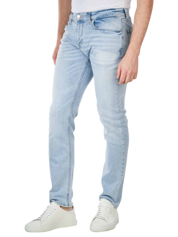 The Tommy Jeans Scanton Slim Fit is made of 2% elastane, 6% polyester and 92% cotton. This model is a figure-hugging five-pocket trouser in elasticated cotton quality with a shortened waistband that fits tightly at the thigh and leg. The waistband is equipped with belt loops. This high-quality model from the Tommy Jeans collection impresses with sustainable, impeccable workmanship and easy care.
