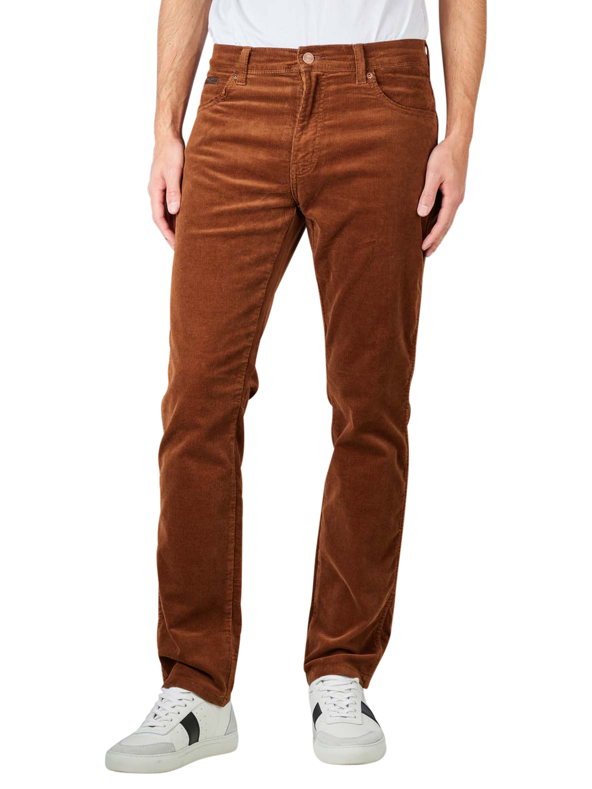 This brown jeans Texas made of thicker fabric from Wrangler is five-pocket jeans made of cotton with a percentage of spandex. The jeans have a Slim Fit and are closed with a zipper. The waistband height is high and the jeans are straight cut at the thighs. The pants can be washed at 40 degrees Celsius on a normal wash cycle.