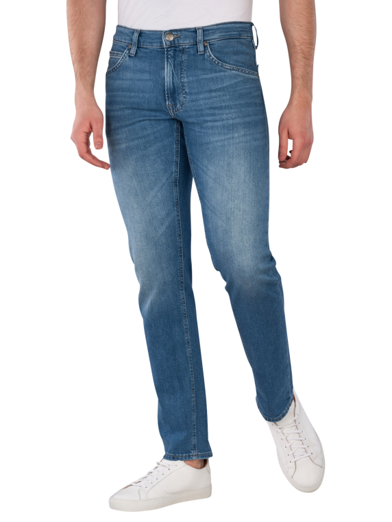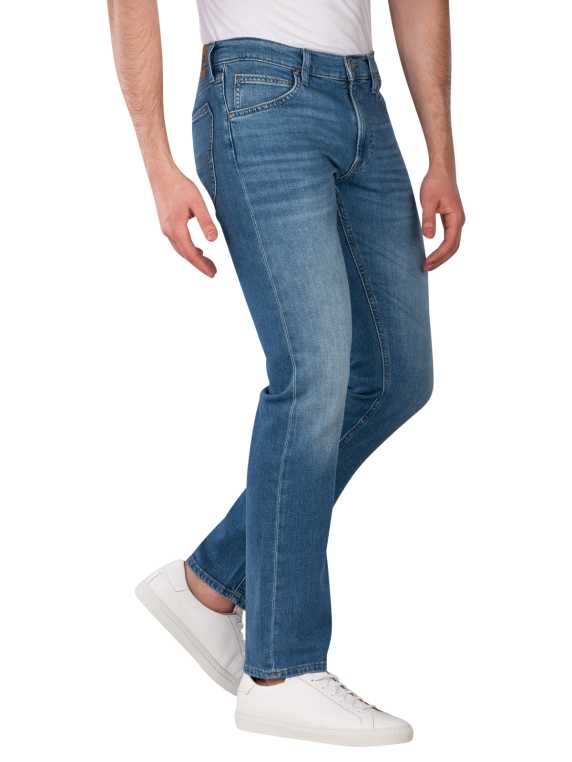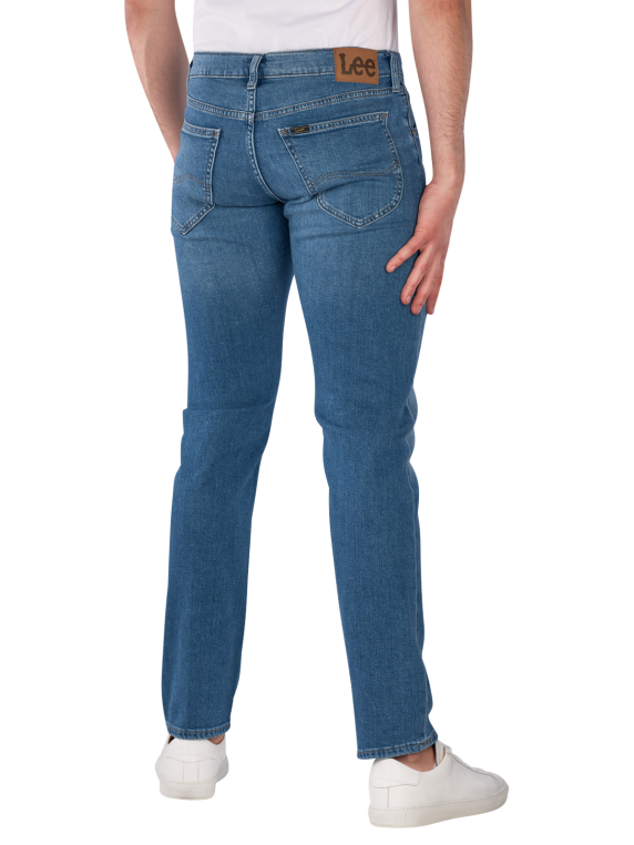 The Lee Daren Jeans Straight Fit Skyfall features a straight leg cut and a mid-rise waist, is in a medium blue color, and has a practical zipper; with its stretch content, it provides freedom of movement and comfort, designed in a five-pocket style, suitable for various leisure activities; care instructions: gentle wash at 30°C, do not bleach.