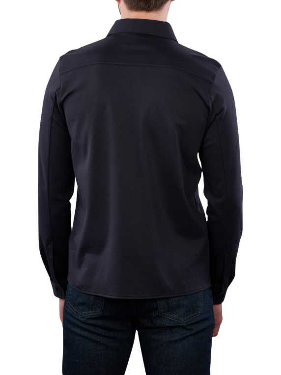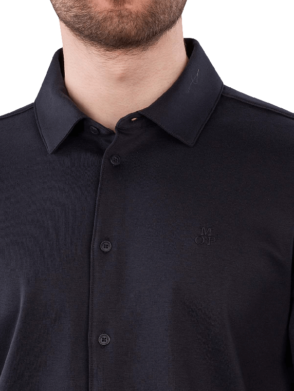 The Marc O'Polo Long Sleeve Polo Shirt Liquid Touch Jersey in Dark Blue features a classic polo collar and long-sleeved cut. It is made from 100% cotton and meets the Global Organic Textile Standard (GOTS). This polo shirt is suitable for formal and informal occasions. The care instructions recommend a gentle wash at 30°C and no bleaching, which supports the longevity of the shirt.