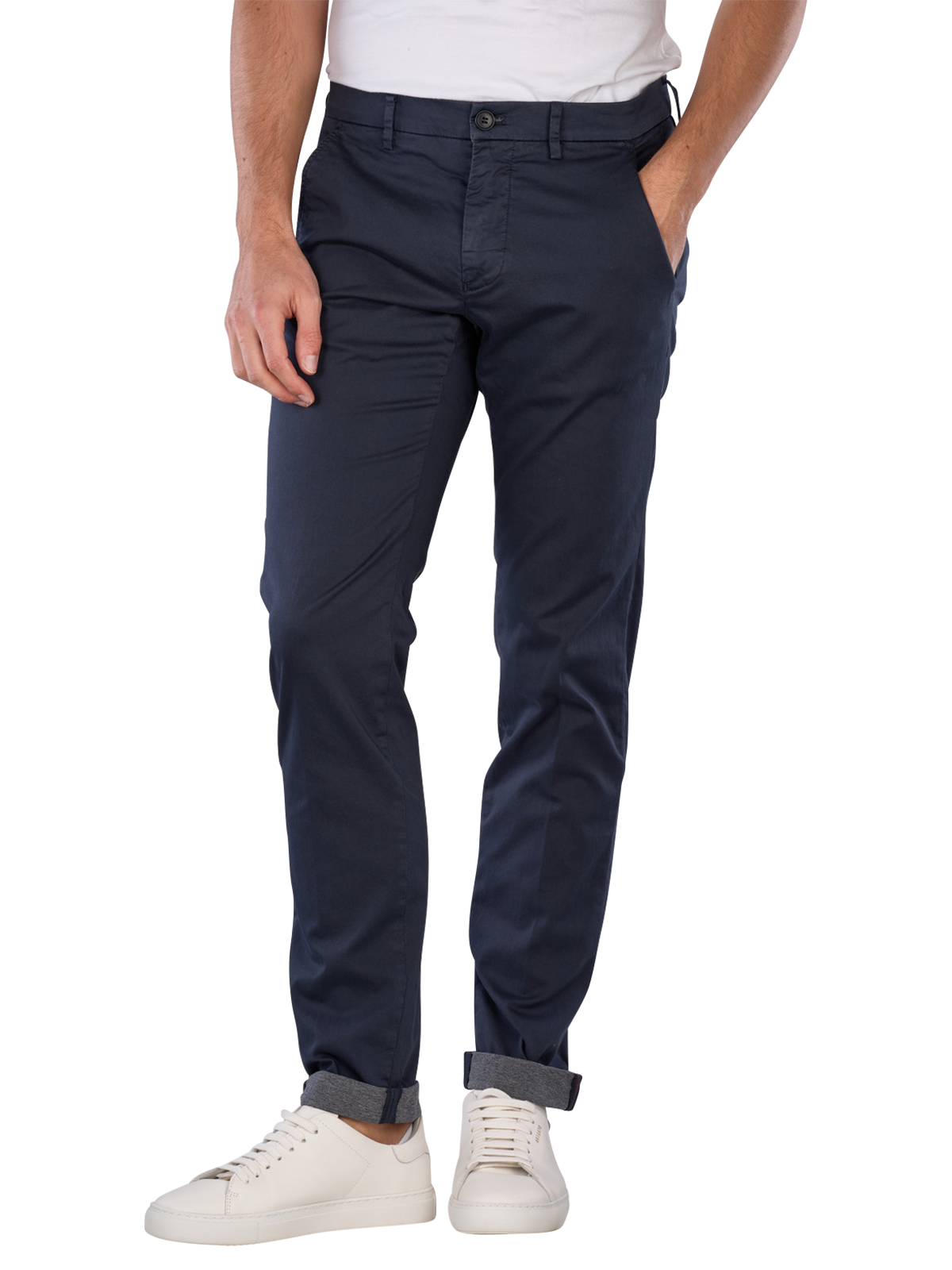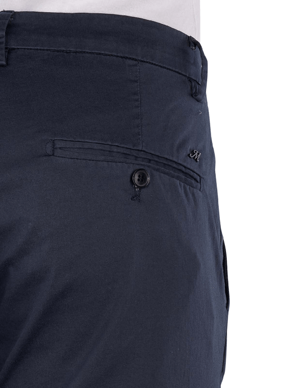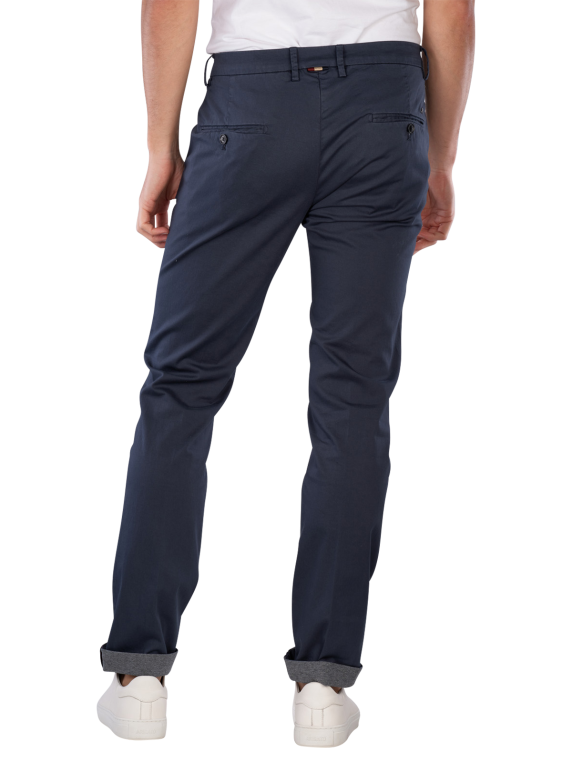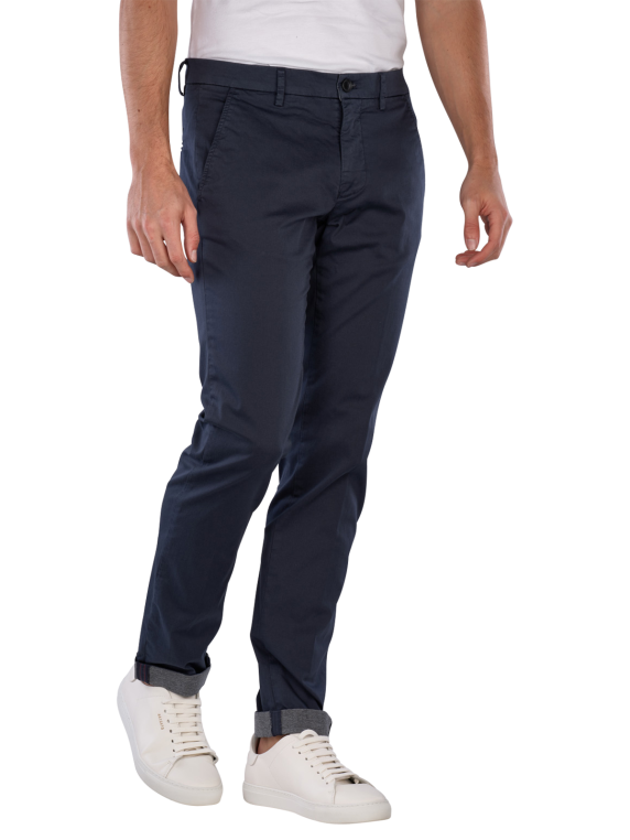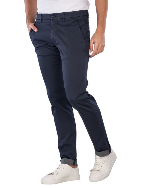 The Mason's Torino Chino Slim Fit Travel Navy offers a slim fit with a mid-rise waist and is available in dark blue. This men's chino pant combines a thin fabric with a stretch component, providing freedom of movement. The zipper allows for easy on and off. It is easy to care for and can be washed at 30°C in a normal wash cycle, making it a practical choice for everyday wear.