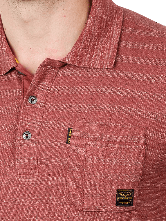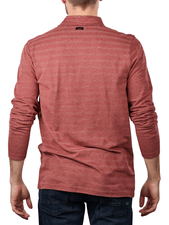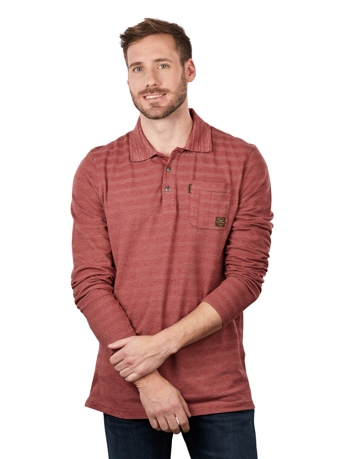 The PME Legend Long Sleeve Polo Jacquard Pique is a modern and comfortable top for men with long sleeves, a polo collar, a short button placket and a breast pocket on the left, where the brand's logo is visible. The polo shirt in the colour henna with subtle stripes has a straight and comfortable cut. The blended fabric with cotton offers a high level of wearing comfort.