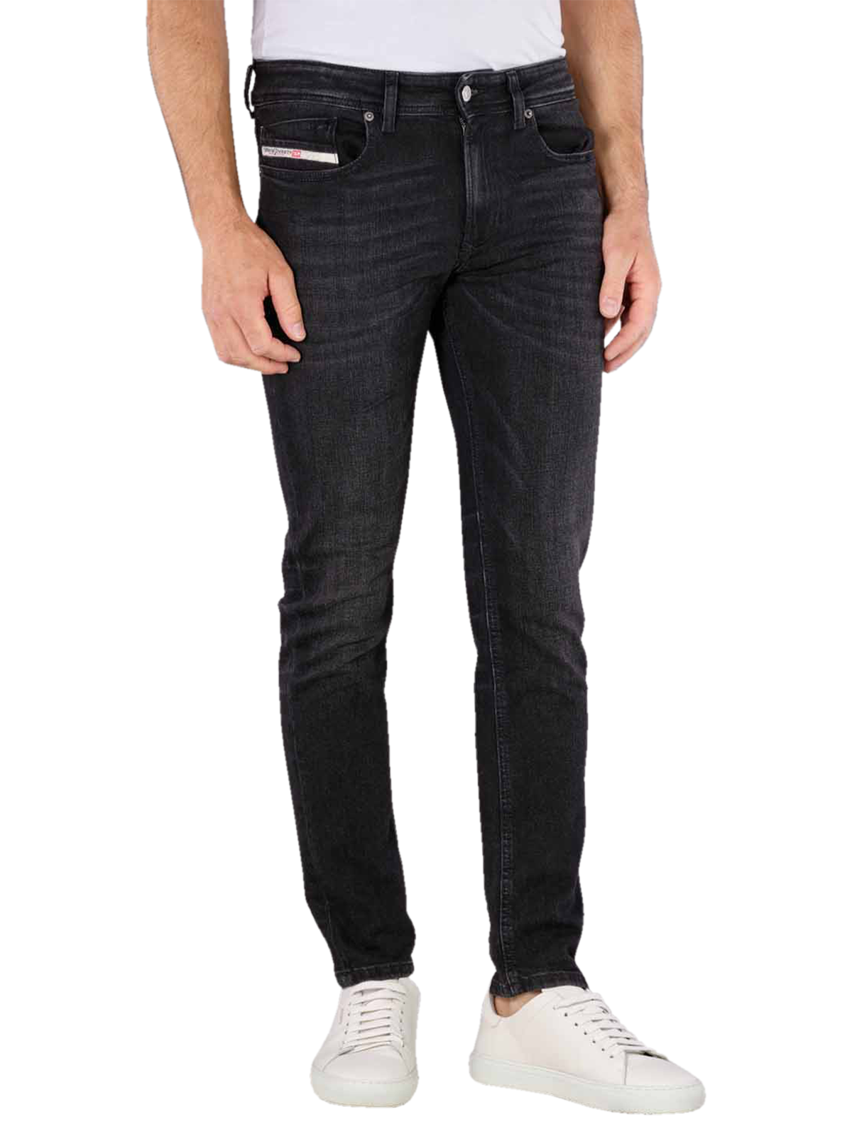The Diesel 1979 Sleenker skinny fit jeans in black are trendy jeans for men. They have a slim fit, a low waist and are made from an elasticated fabric blend. The five-pocket jeans come with a practical zip and feature a simple black wash. Easy-care at 30°C on a gentle wash cycle, they are made from 71% cotton, 14% modal, 14% polyester and 1% elastane.