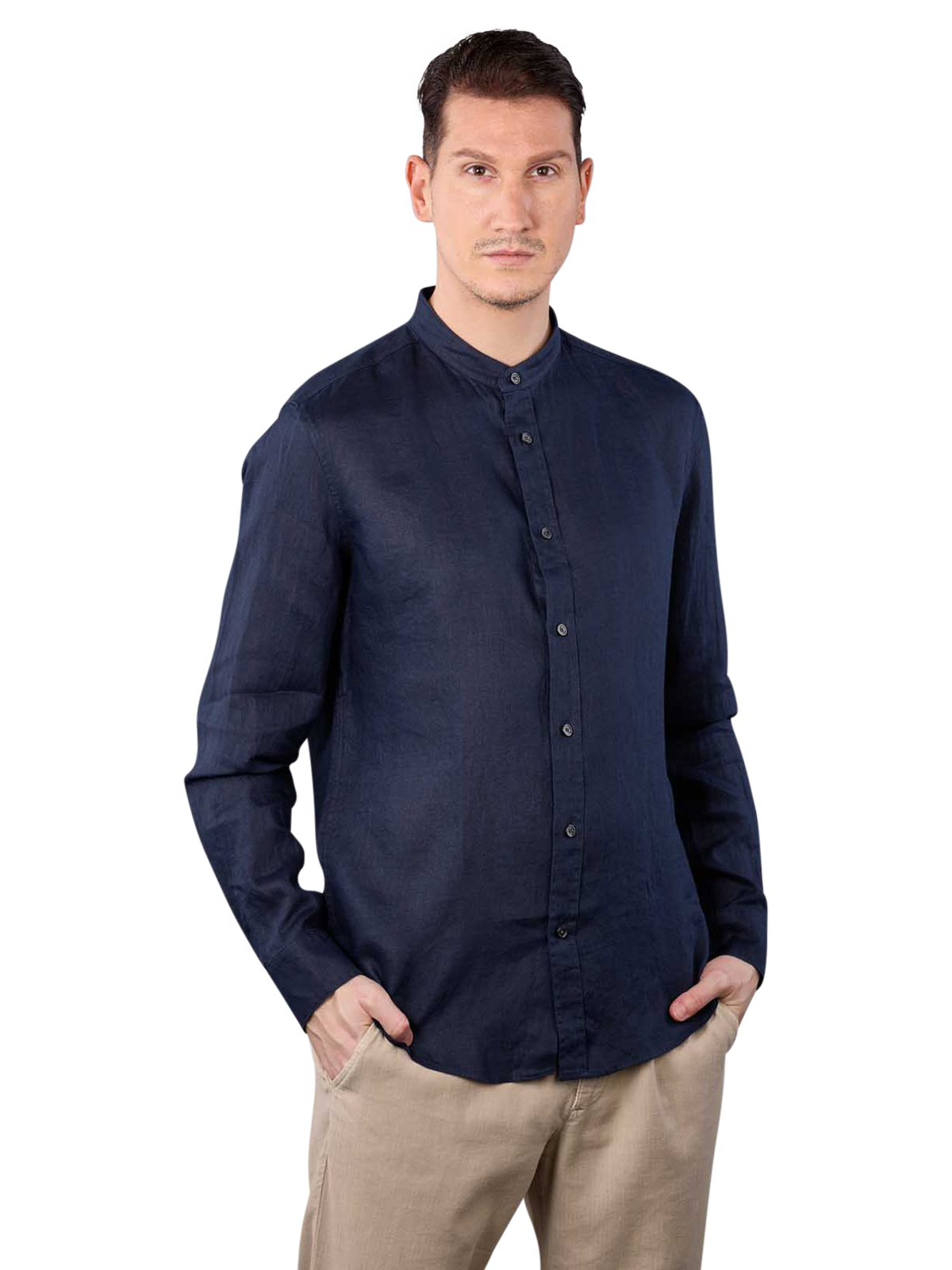 Pure linen in a beautiful dark denim blue was used for the Linen Tarok Shirt with the Stand Up Collar from Drycorn. As the name suggests, the full-length button placket ends in a small stand-up collar. It gives the pocketless shirt a modern and elegant look. Despite the long sleeves, the shirt is very comfortable to wear even at high temperatures and can of course be machine washed.