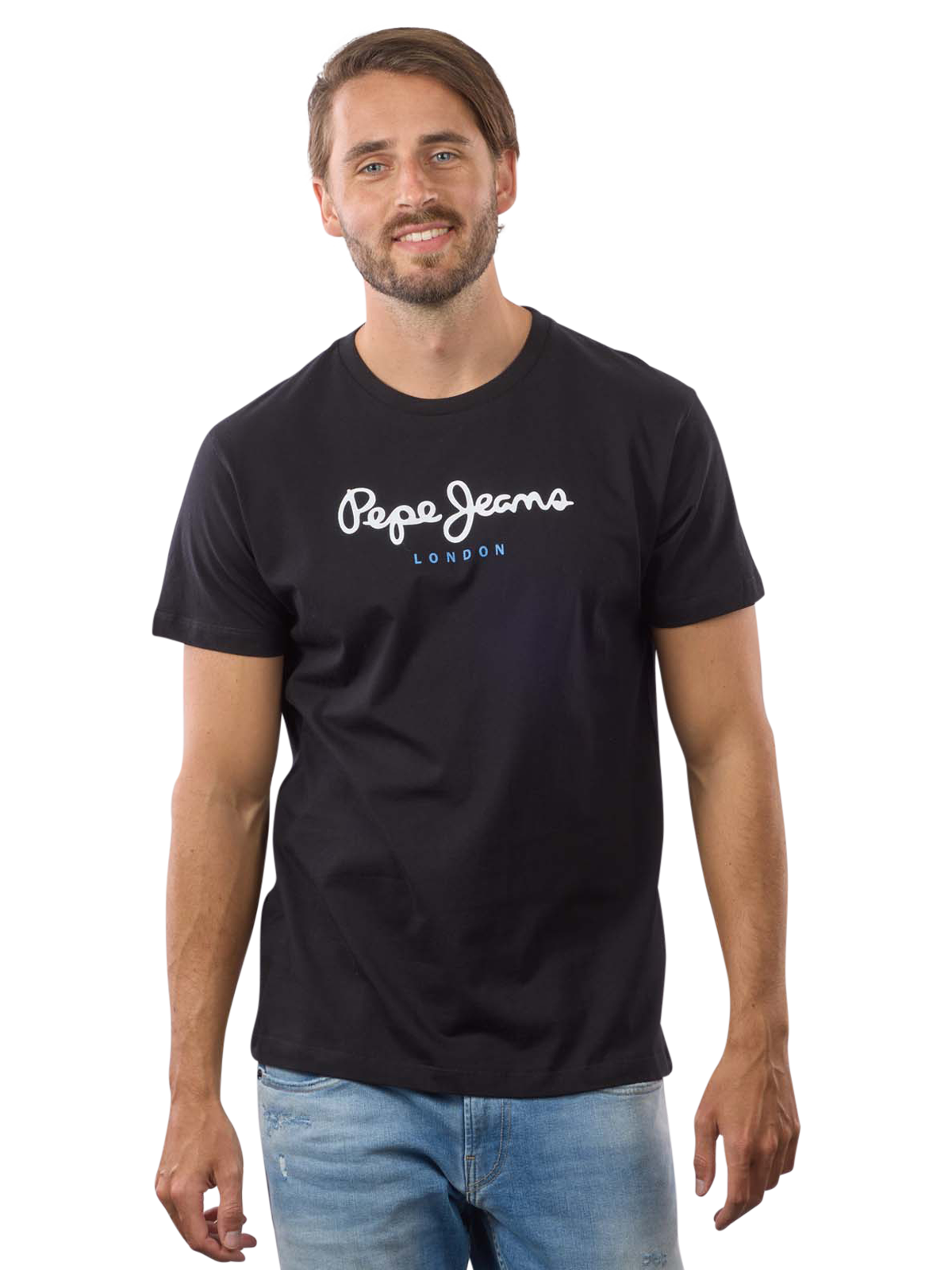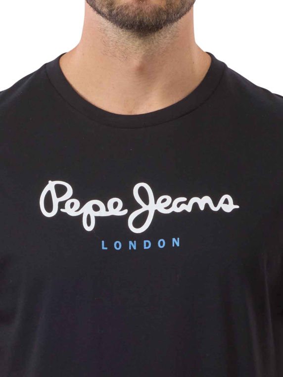 The black print T-shirt by Pepe Jeans with a round neckline and short sleeves immediately catches the eye with the highlighted white lettering of the well-known Italian label. The shirt without a breast pocket is made of 100% cotton and has a regular fit for a perfect fit.