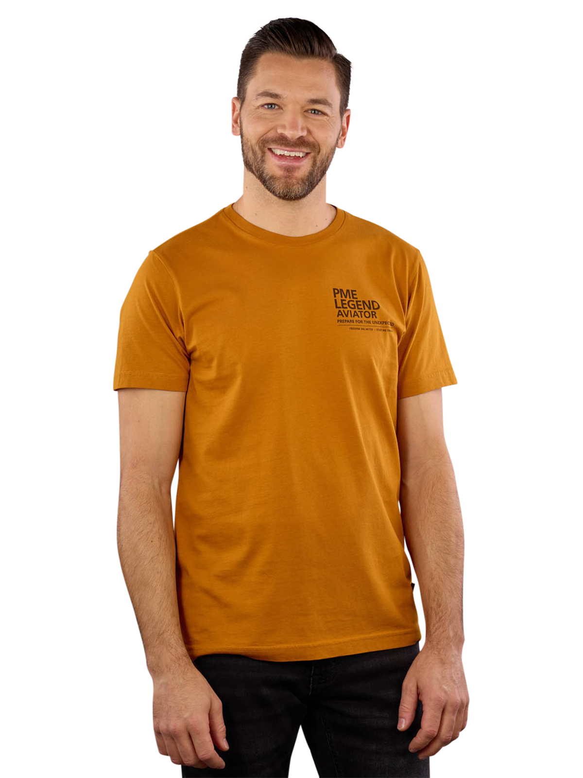 The PME Legend Short Sleeve T-shirt made from single jersey in the colour Buckthorne Brown is a high-quality garment for men that is characterised by its round neck collar and comfortable cotton quality. The T-shirt is made from 100% recycled material and is available in the colour yellow. It is easy to care for and should be washed on a gentle cycle at 30°C. Bleaching is not recommended to preserve the quality.