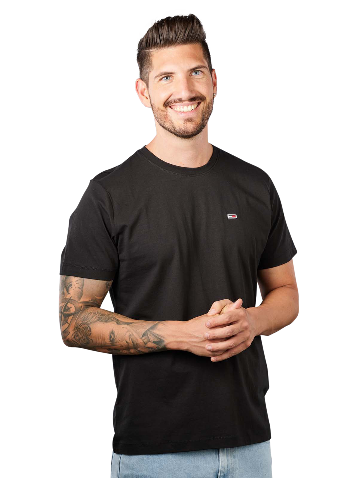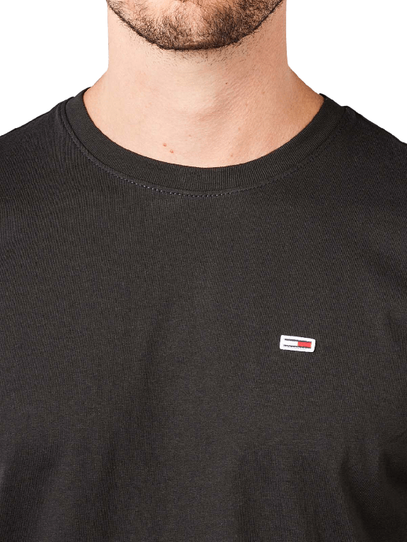 This black Classic Jersey T-shirt from Tommy Hilfiger Jeans features sustainably chosen organic cotton materials and simple elegance. With its round neckline and short sleeves, it can be combined with any style as a casual men's top. The discreet logo on the left chest area gives the T-shirt a special extra.