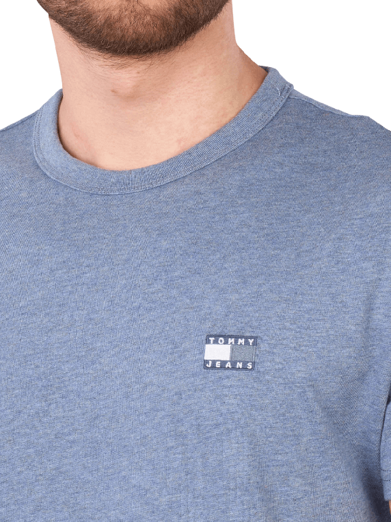 The Tommy Jeans Regular Badge T-Shirt in Medium Blue features a classic round neckline and is made from 100% cotton. It is designed for men and is ideal for everyday wear or casual occasions. The care instructions recommend a special gentle wash cycle at 30°C and the use of oxygen bleach. With its timeless design and comfortable fit, it is a versatile addition to any wardrobe.