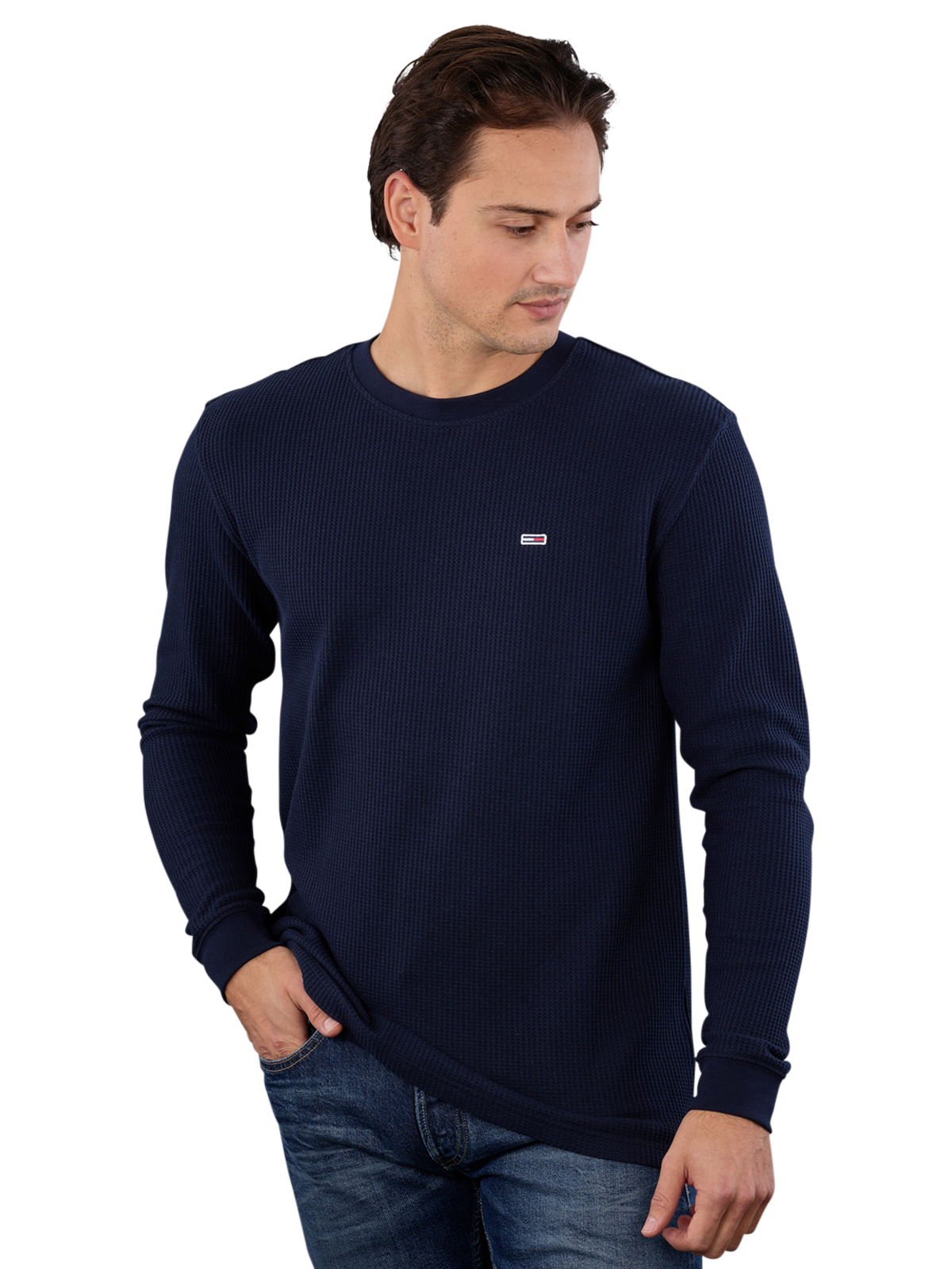 The Tommy Jeans Regular T-shirt Waffle in dark blue is ideal for men. It has a round neck and is made from 60% cotton and 40% polyester. Care instructions: Special gentle wash cycle at 30 degrees, use oxygen bleach only. Perfect for offering a stylish and comfortable look in the T-shirt category.