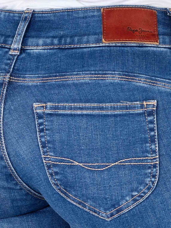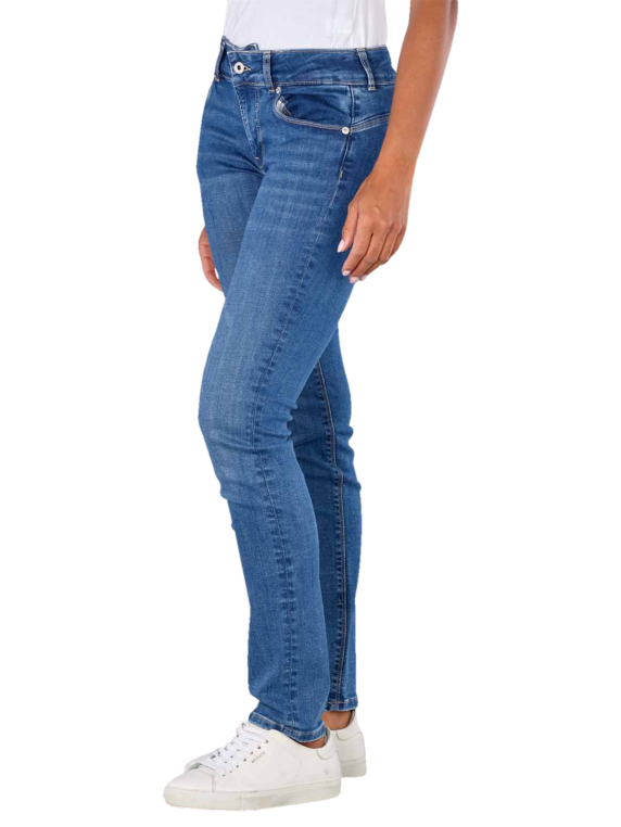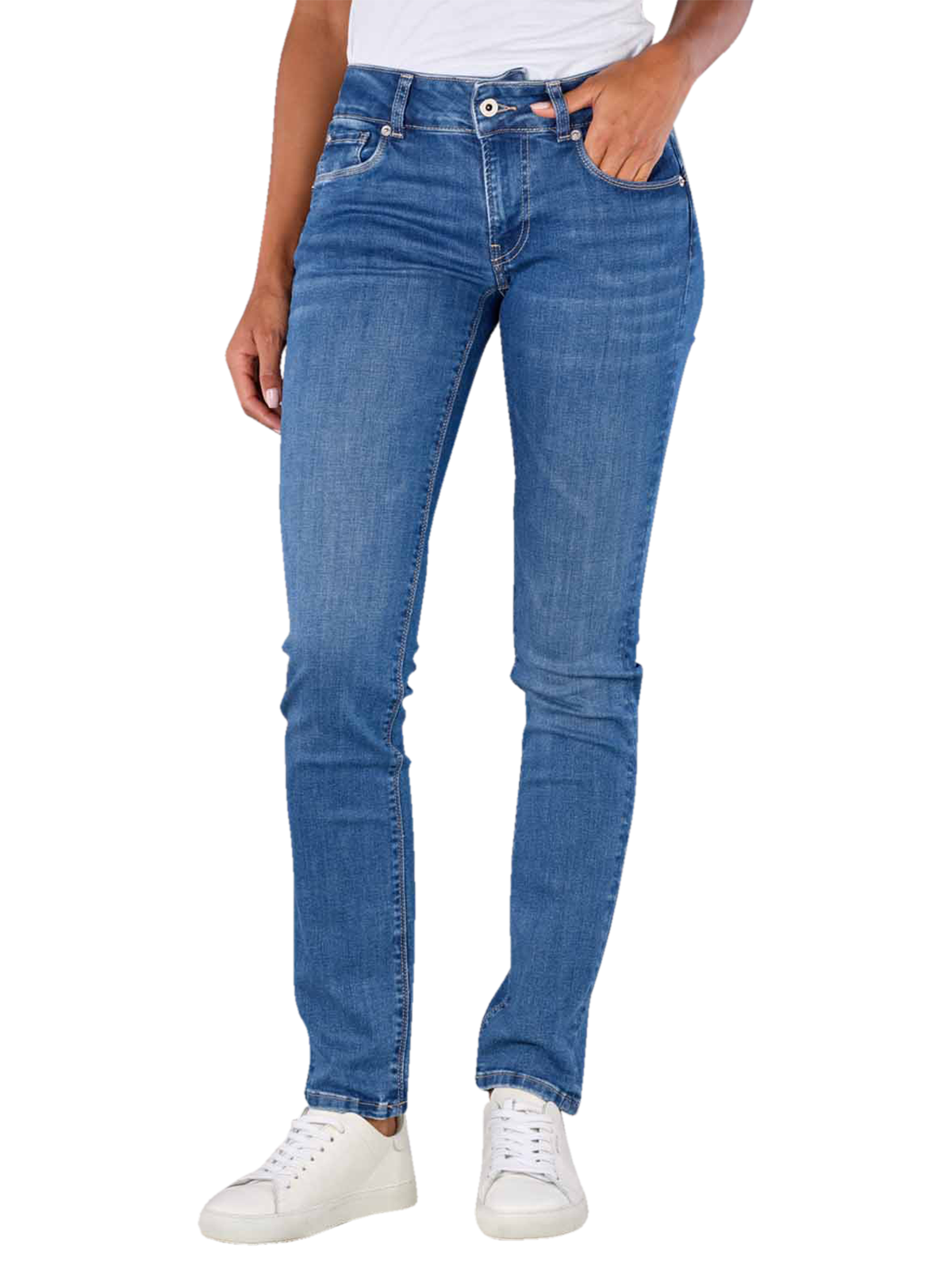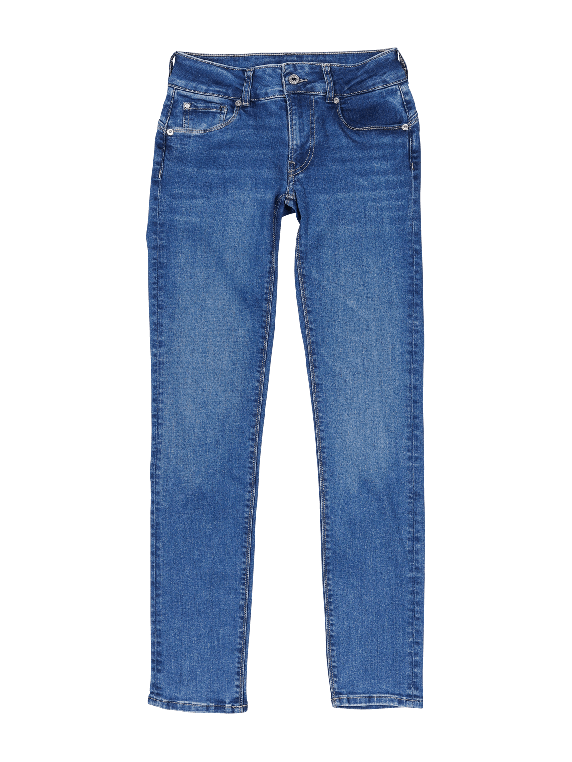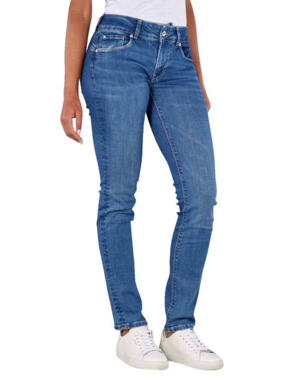 The Pepe Jeans Low New Brooke offers a slim fit with a straight leg cut. The medium blue jeans have a mid-rise waist and are designed for women. Made from 84% cotton, 15% polyester and 1% elastane, they offer a standard fabric thickness and stretch comfort. These five-pocket jeans with a medium wash have a practical zip fastening and are washable at 30°C. Perfect for everyday wear.
