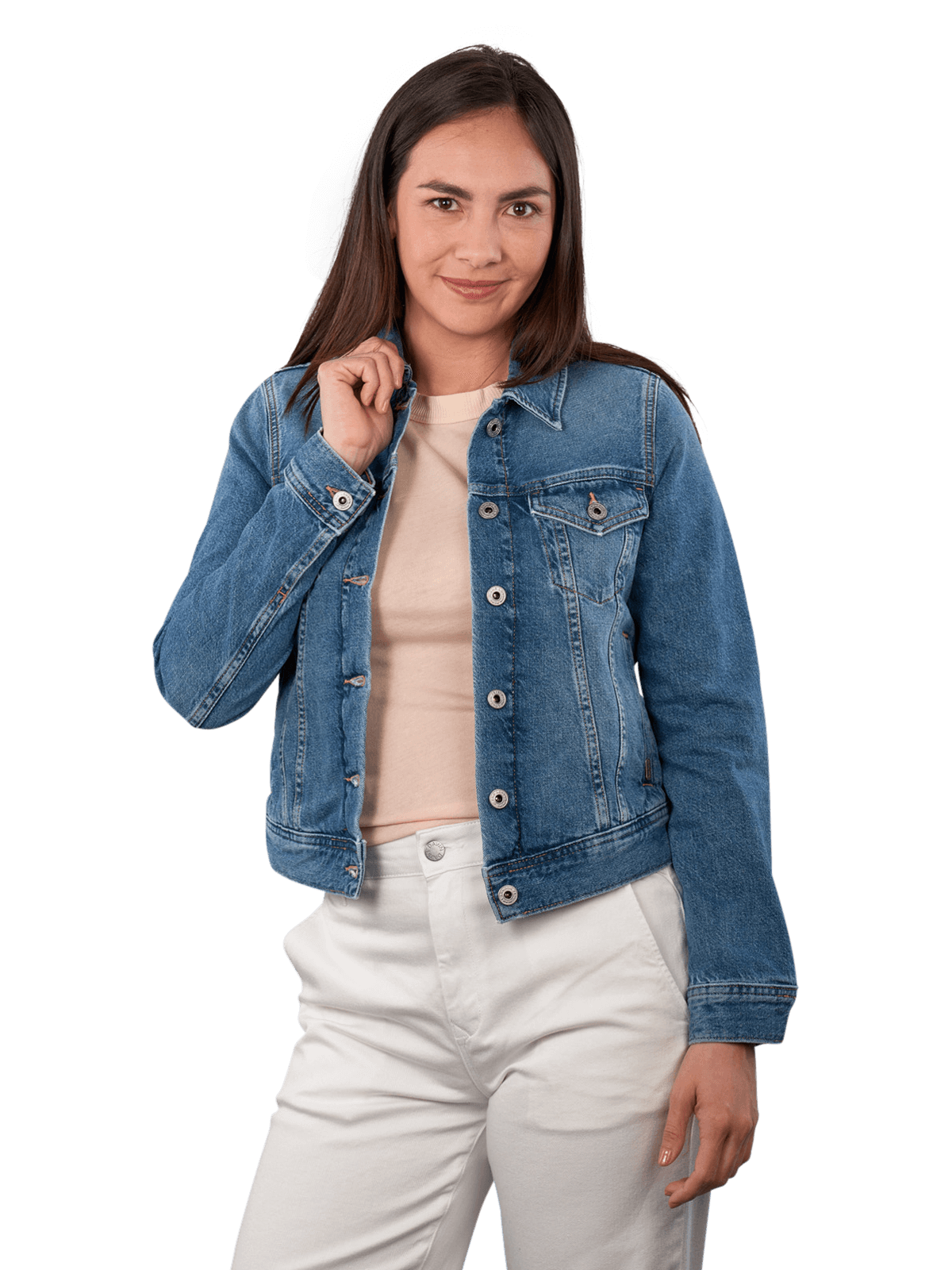 Discover the Pepe Jeans denim jacket in a slim fit in a trendy mid blue - ideal for fashion-conscious women! This jacket does not have a hood and impresses with its timeless design. Made from 100% cotton, it not only offers comfort but also durability. Easy to care for on a normal wash cycle at 40°C, it is perfect for everyday wear. Combine it with your favourite outfits and create fashionable accents - a must-have for every wardrobe!