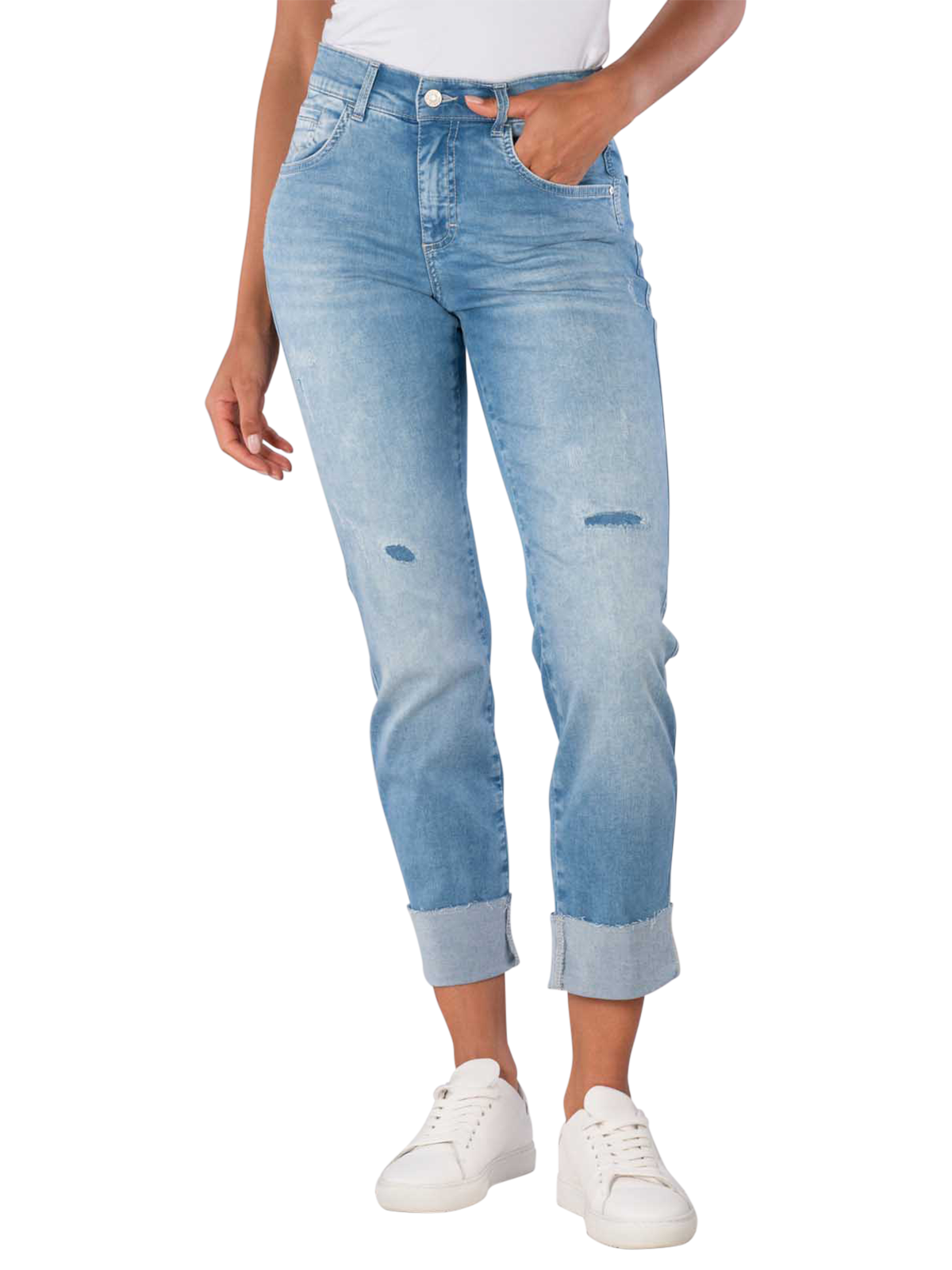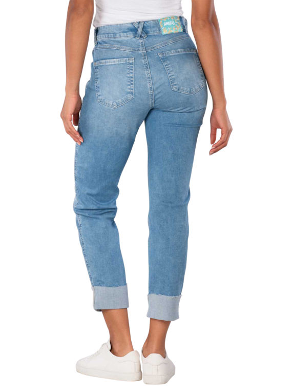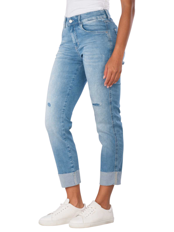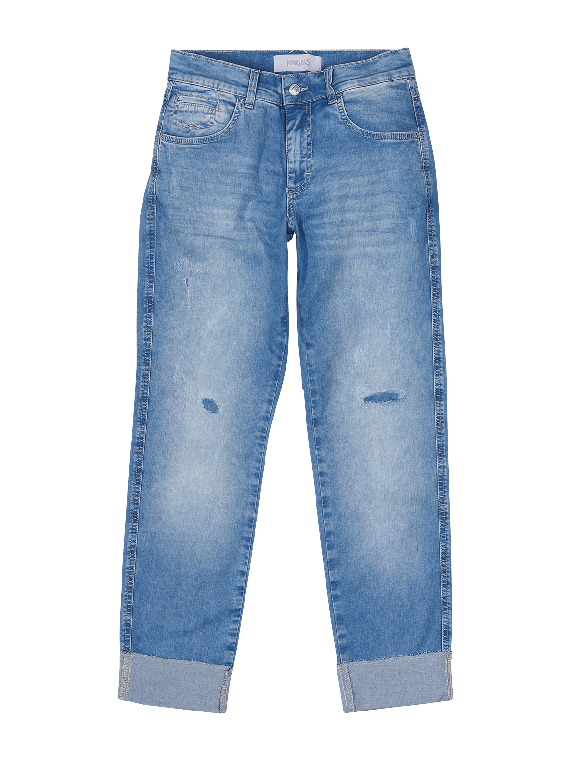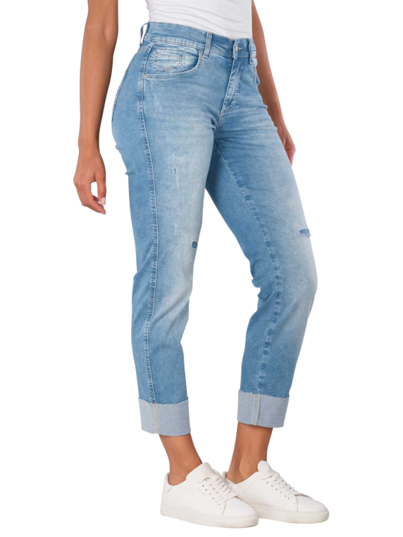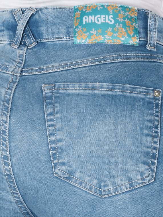 Discover the Angels Darleen Jeans Straight Fit in the charming color Heaven Blue. These light blue jeans combine a straight leg cut with a mid-rise waist, providing a flattering fit. The stretch content ensures optimal comfort, while the five-pocket style gives them a casual look. Ideal for everyday wear, they can be combined in various ways. Made from 89% cotton, 8% polyester, and 3% elastane for a pleasant wearing experience all day long!