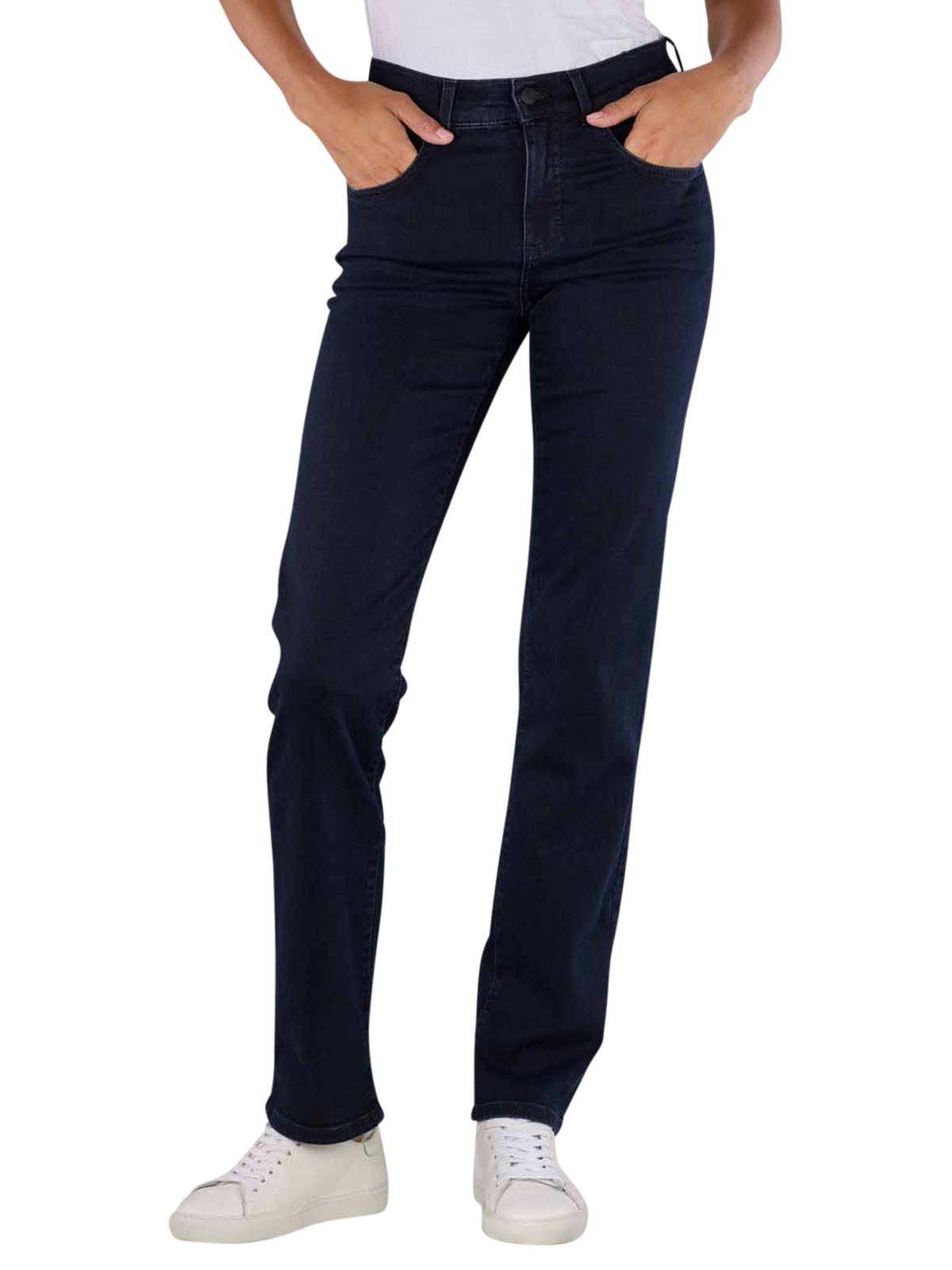 The Angels Dolly jeans in sporty denim and dark blue colour impress with their straight fit and high waistband. The straight leg cut and the standard thickness of the fabric offer optimum comfort. The stretch content ensures flexibility. Made from 92% cotton, 6% polyester and 2% elastane, they have a classic five-pocket look and zip fastening. Suitable for gentle wash cycle at 30 degrees, do not bleach.