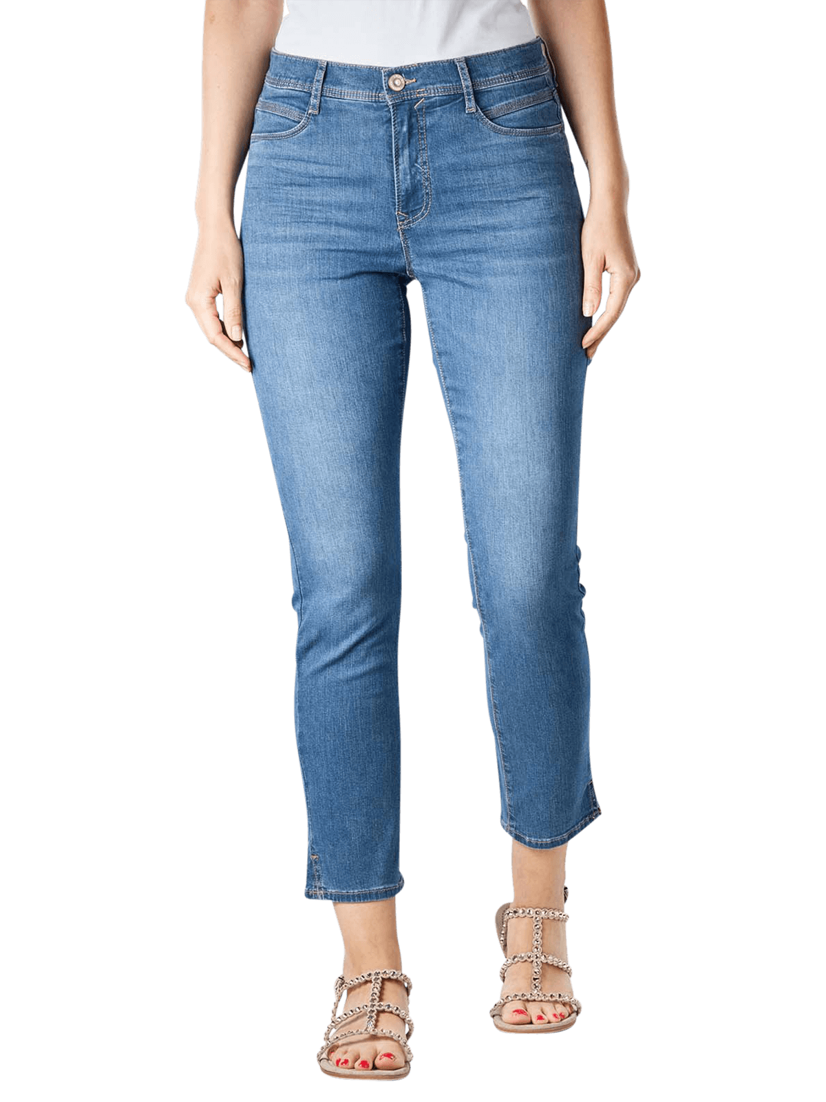 These 7/8 jeans made of organic cotton with zipper and perfect stretch content have been produced from a pleasant thin fabric. The five-pocket jeans have a combination of slim and straight fit. The thighs and the leg cut are straight in the course. The back pockets with attractive seam gradient are particularly attractive.