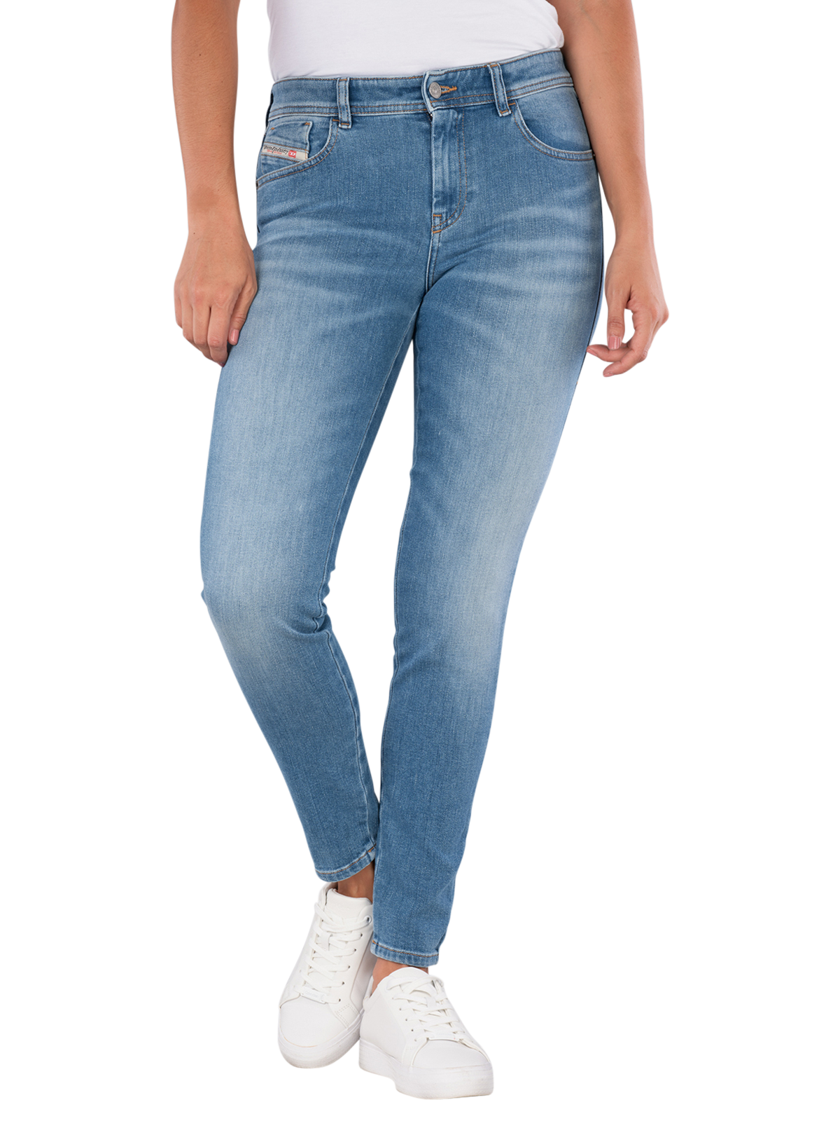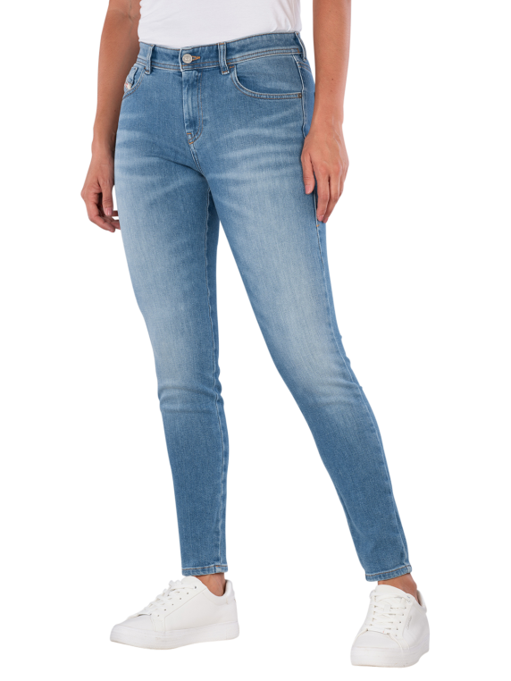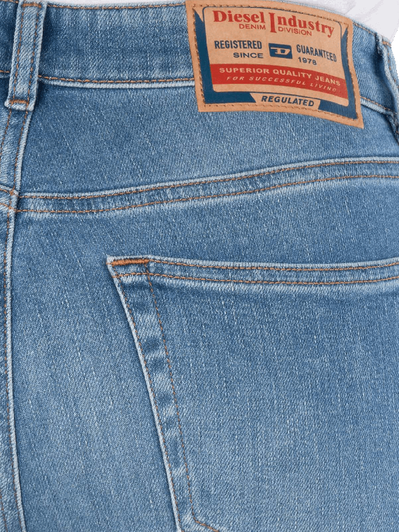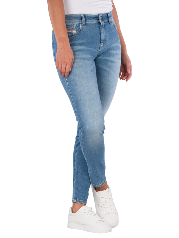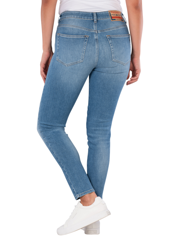 The Diesel 2017 Slandy Jeans in Light Blue offers a slim fit with a mid-rise waist. It features a classic five-pocket style and a zipper. The jeans are made from a standard thickness fabric with stretch, providing freedom of movement. The light to medium wash gives it a modern look. Care instructions: gentle wash at 30°C, do not bleach.