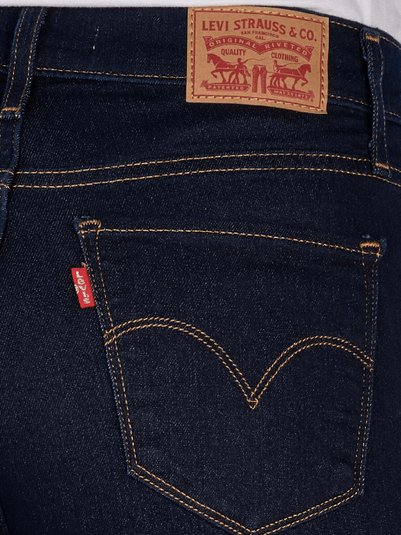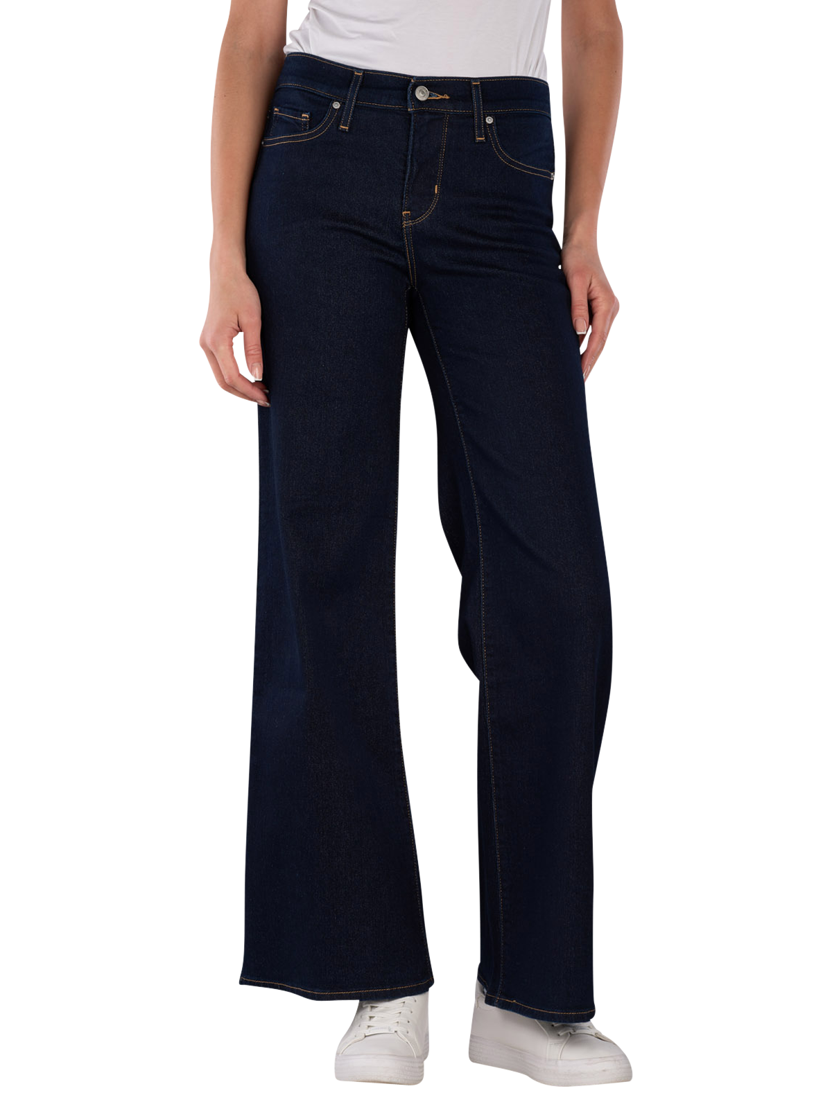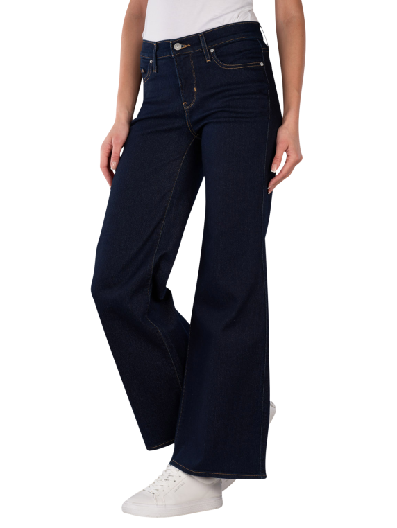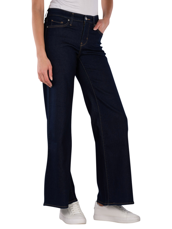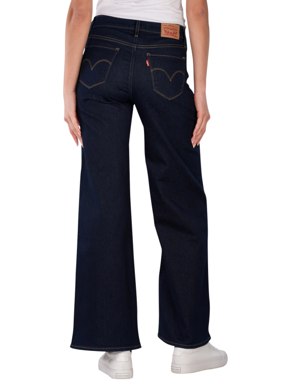The Levi's 318 Jeans Shaping Wide Leg in Dark Blue features a wide leg opening and a mid-rise waist, equipped with a zipper and a five-pocket design, while the stretch content provides additional comfort and freedom of movement, making these jeans suitable for various occasions and versatile to combine; care instructions: normal wash cycle at 30°C, do not bleach.