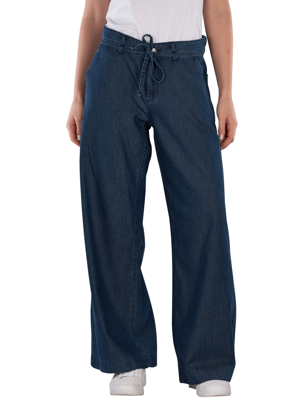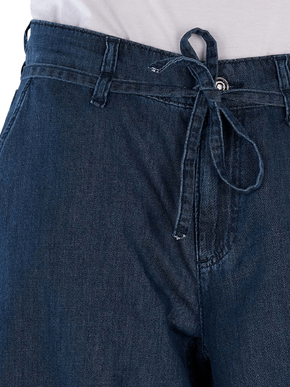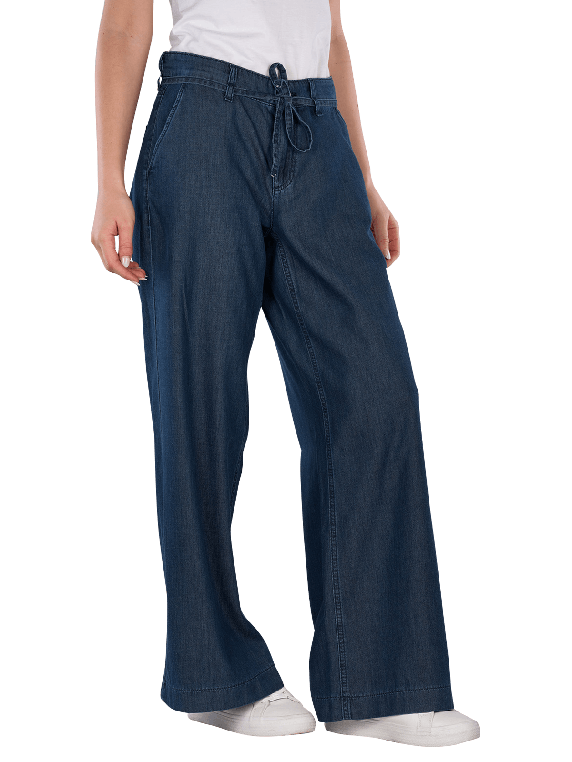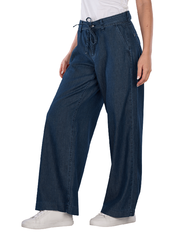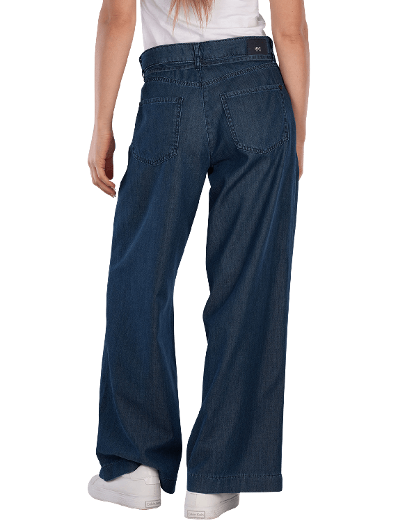 The Mac Wendy Jeans Wide Leg Fluid Tencel Simply Blue Wash features a wide leg opening and a mid-rise waist. The dark wash provides an elegant look. These jeans are made from a lightweight fabric and have no stretch, making them ideal for a casual yet stylish appearance. They are perfect for pairing with various tops and shoes.