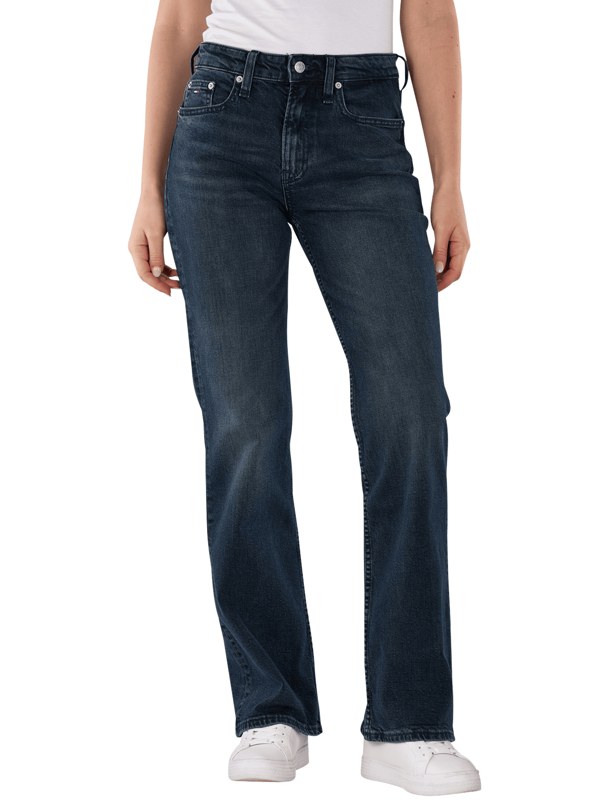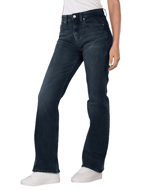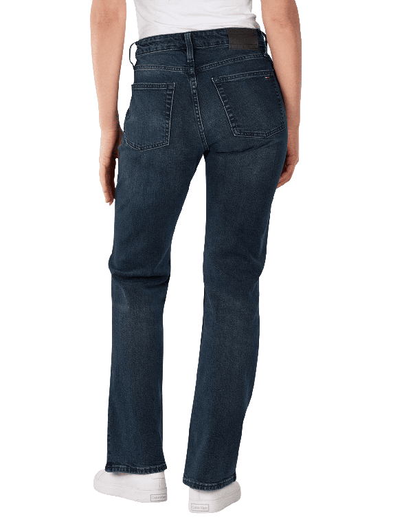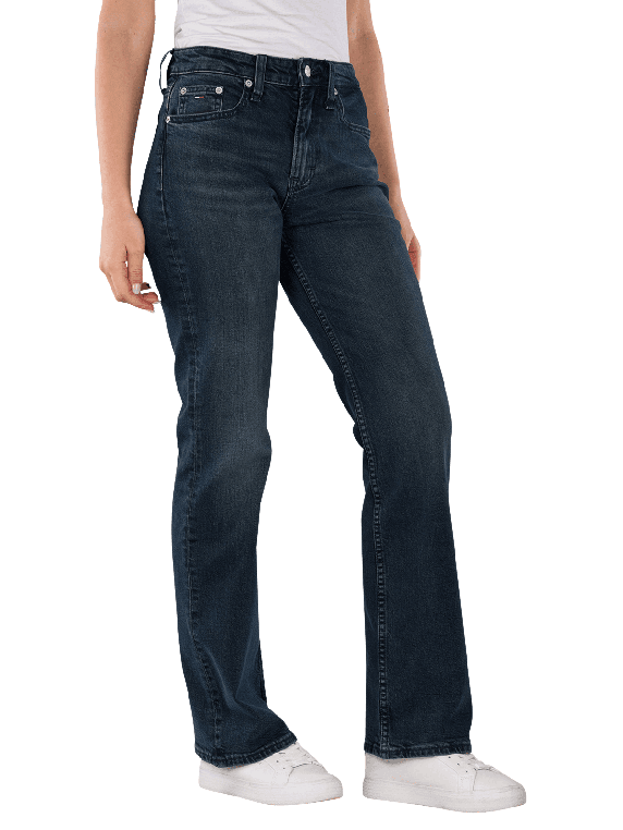 The Tommy Jeans Cleo Mid Rise Bootcut Denim Blue Black features a wide leg opening and a mid-rise waist. The dark wash provides a timeless look. With a stretch content of 1%, the jeans adapt to the body shape and offer comfort. The five-pocket design allows for practical storage. It is suitable for a normal wash at 30°C and is easy to care for.